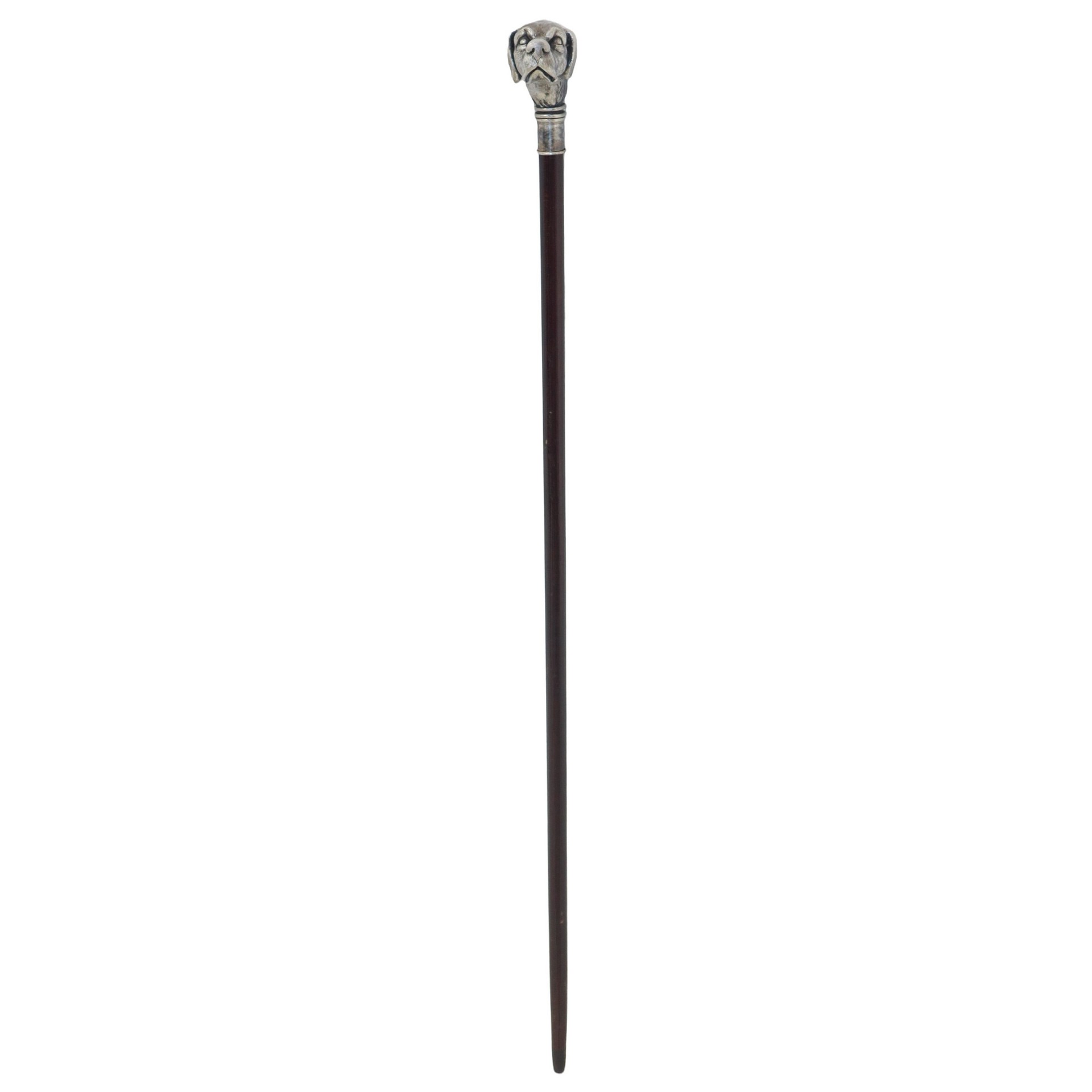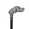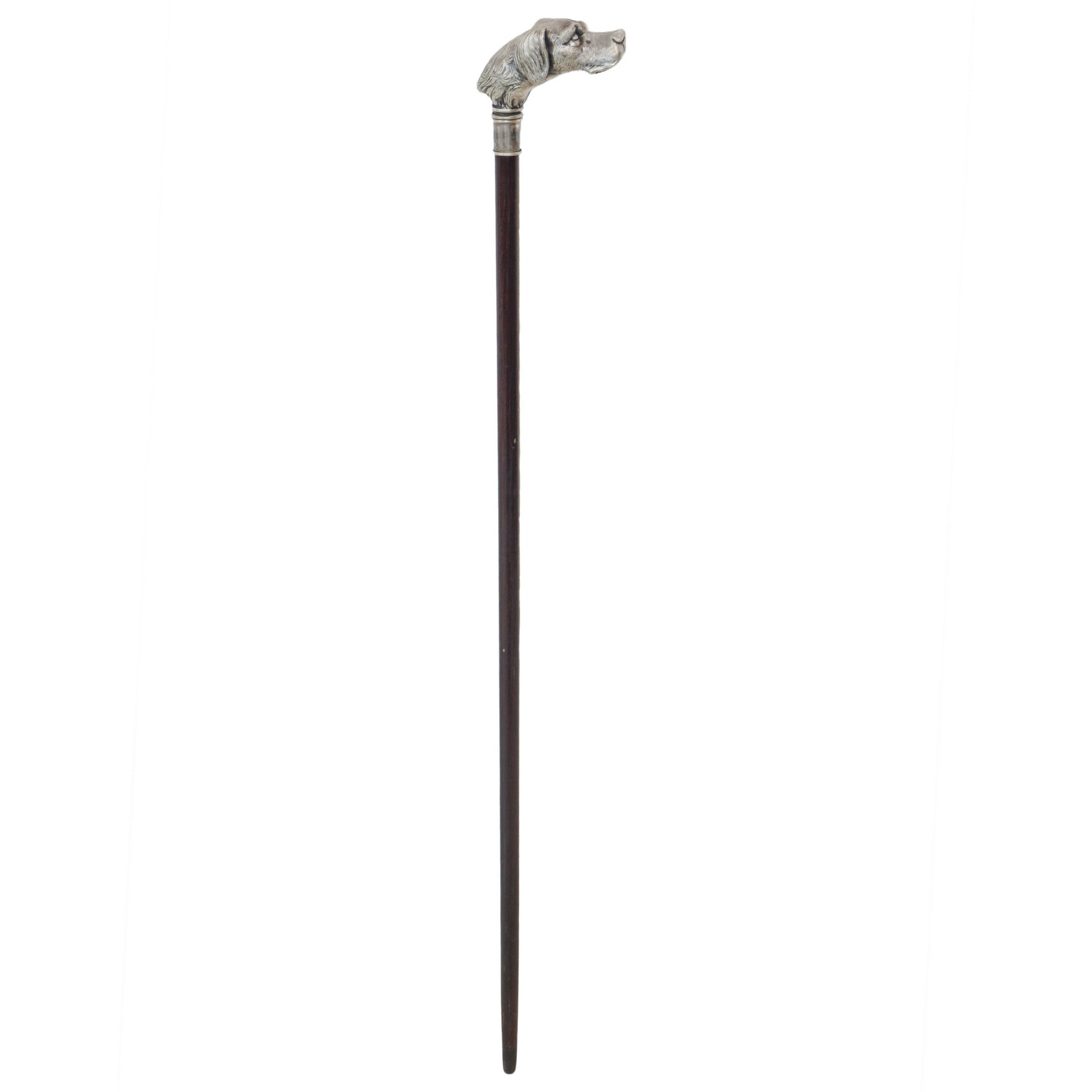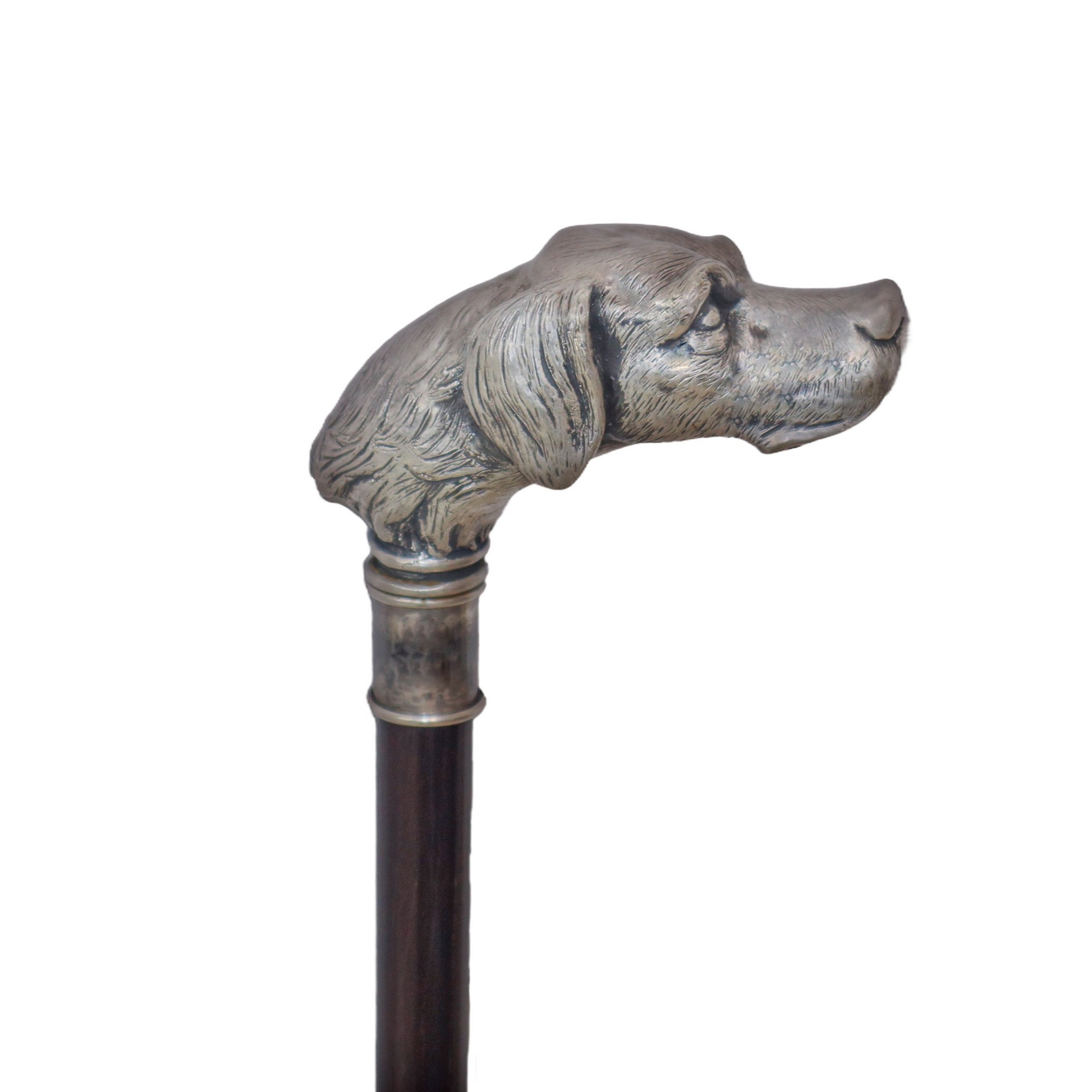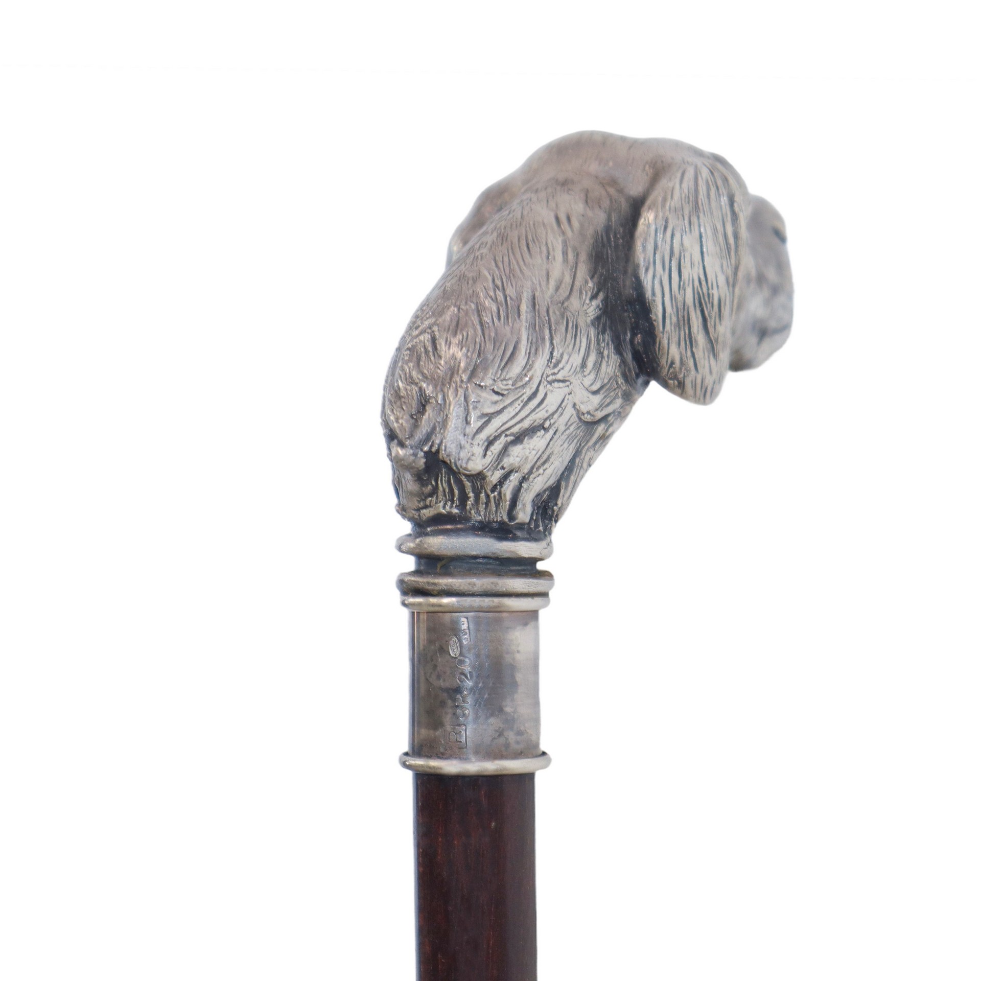 Bastone in legno di malacca con impugnatura a forma di testa di cane in argento, fine 19° secolo