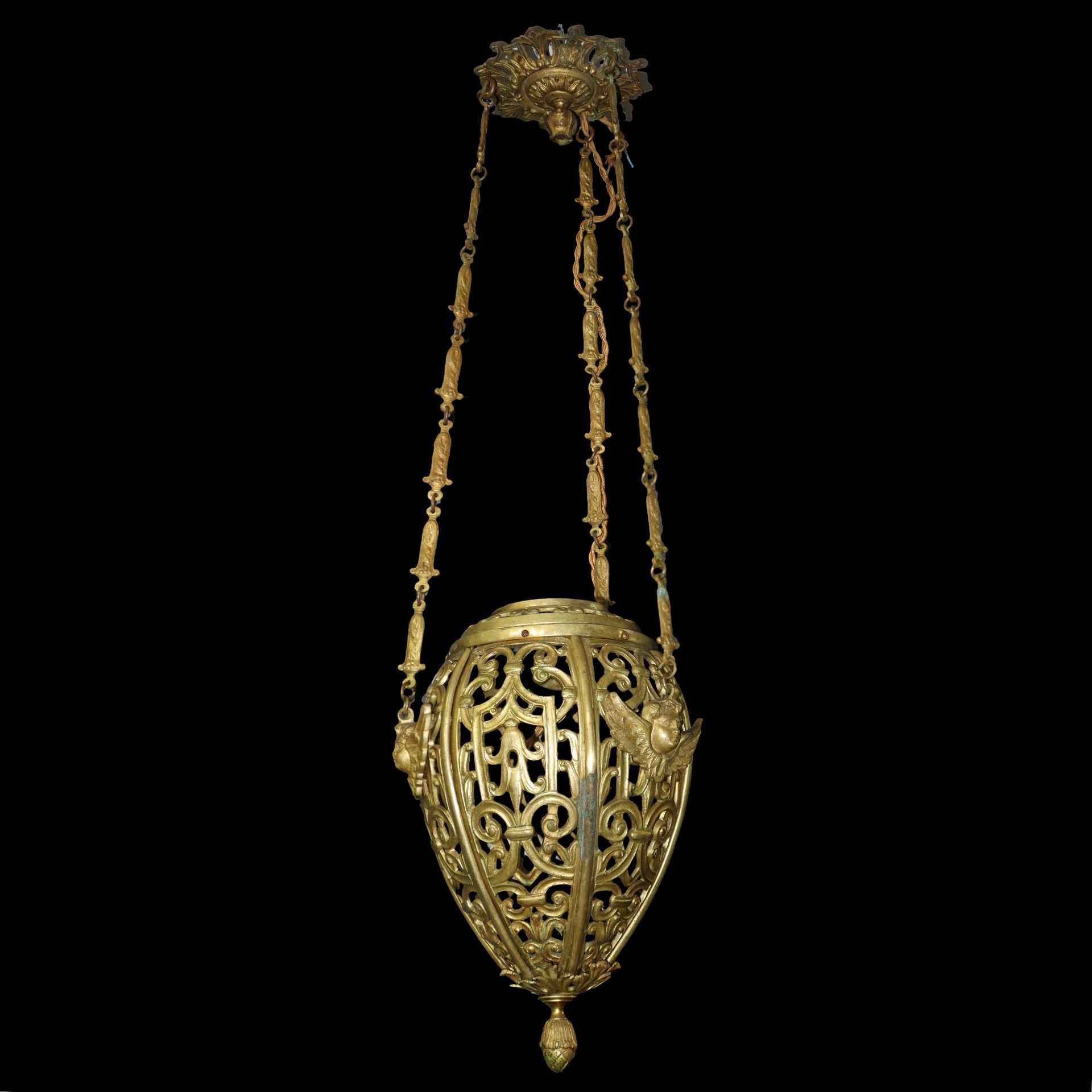Lanterna in metallo traforato e dorato H cm 85 Con zefiri ai lati.Con zefiri ai lati.