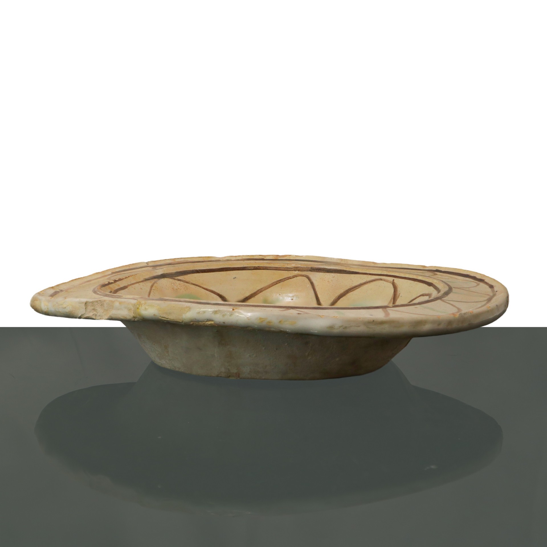Piatto in maiolica policrama con raffigurazione di uccello al centro. , Central Italy, 14° secolo H cm 4 - diam. cm 26 Nei toni del marrone manganese e verde ramina a motivi geometrici.Nei toni del marrone manganese e verde ramina a motivi geometrici.