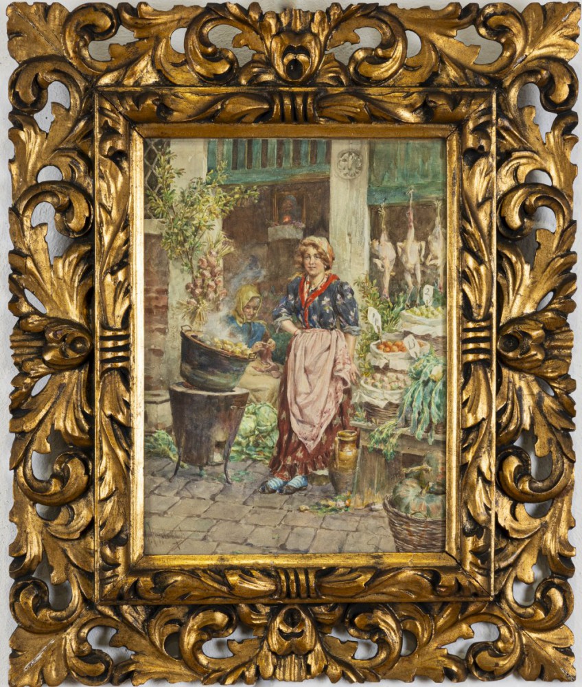 Giuseppe Vizzotto Alberti Oderzo(TV) 1862 - Venezia 1931, La bella fruttivendola Acquarello su carta cm 35x26 firmato in basso a sx