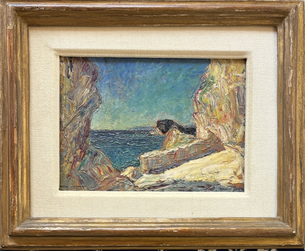 Agostino Bosia Torino 1886 - 1962, Marina ligure Olio su tavoletta cm 16x22 firmato in basso a sx datato 1914