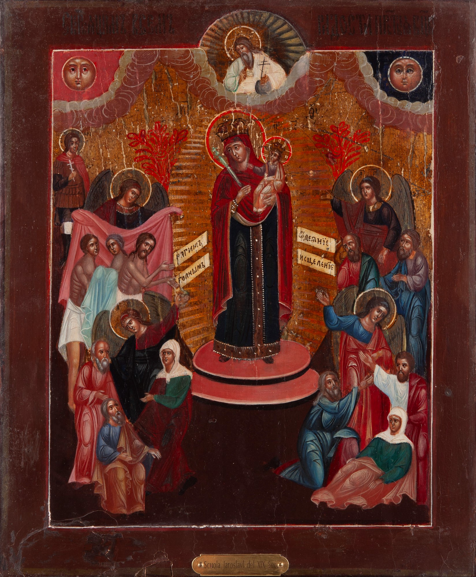 Al centro la Vergine col Bambino affiancata da persone afflitte da malattie e dolori. In alto angeli rivolti verso i malati, come se stessero rivolgendo loro le preghiere inscritte.