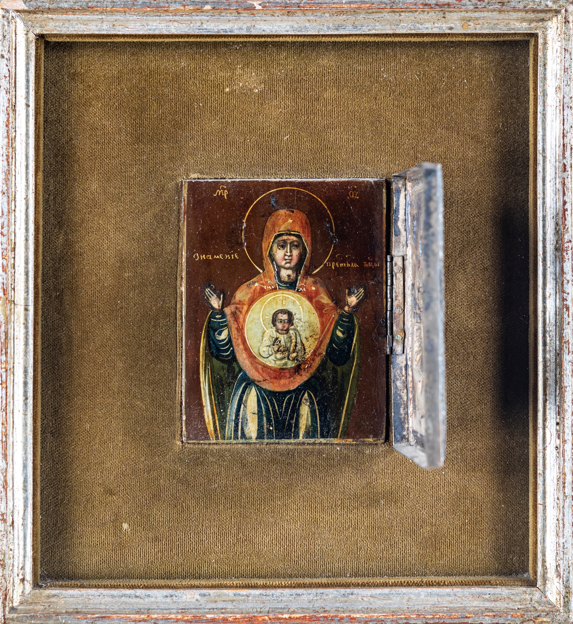 Iconografo russo del XIX secolo Madre di Dio del Segno olio su tavola cm 11x8,5 - in cornice cm 25x23 Maria è ritratta in atteggiamento orante e l'immagine del Bambin Gesù è racchiusa in un clipeo posto all'altezza del suo ventre; ritza in rame sbalzato