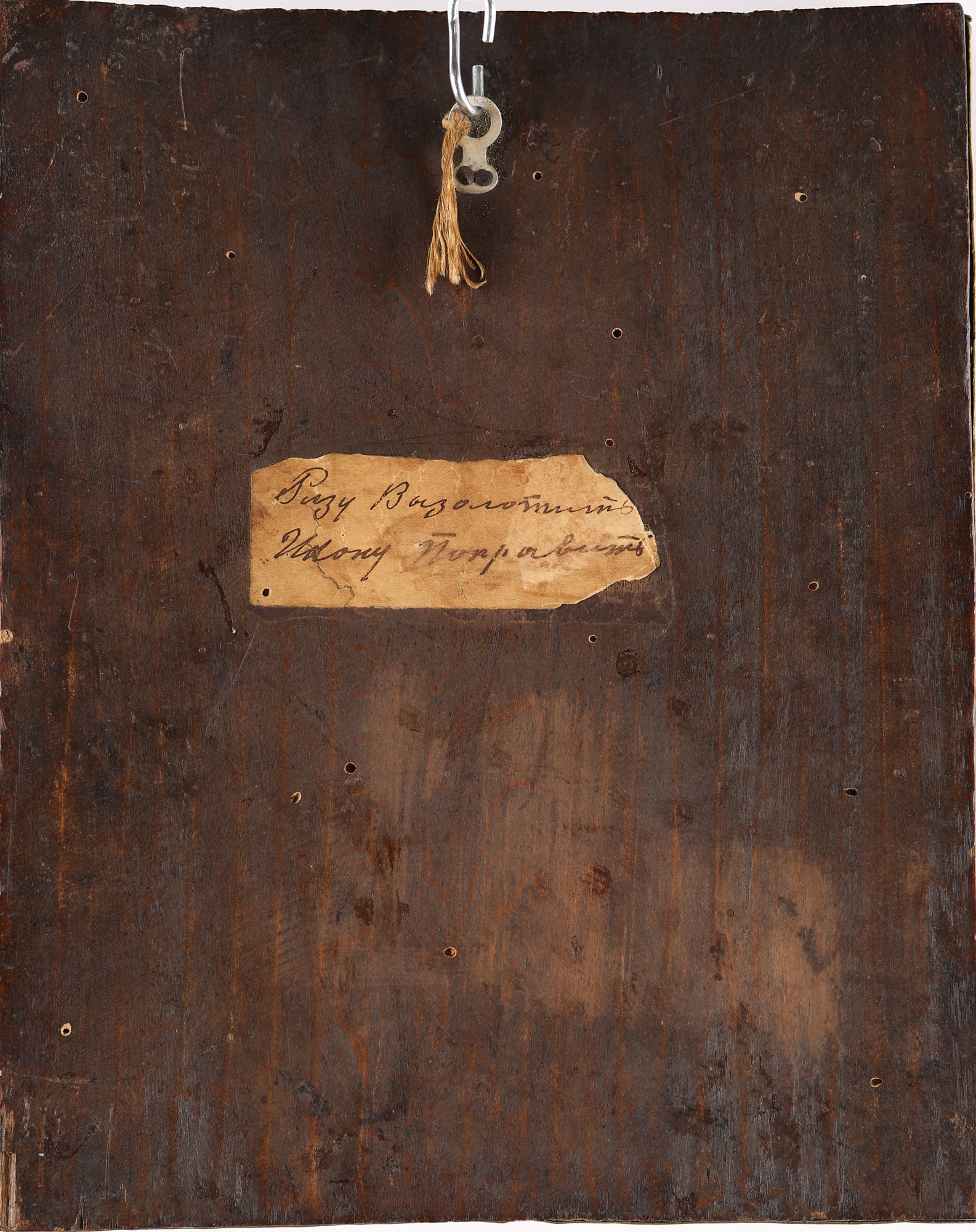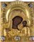 Scuola russa del XIX secolo Madonna col Bambino tempera all'uovo su tavola cm 31x25 ritza in rame dorato impreziosita da cinque medaglioni ovali in smalti policromi con ritratti di Santi disposti agli angoli superiori e lungo il profilo inferiore
