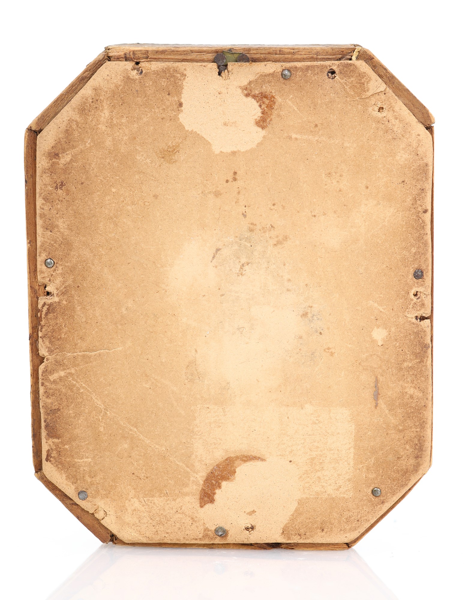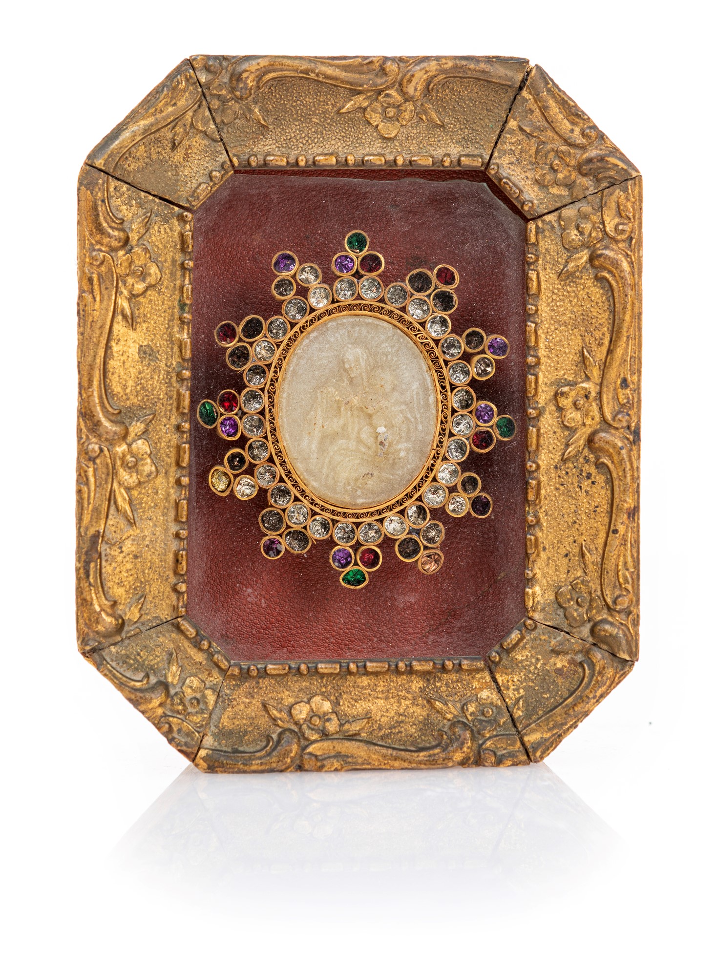 Agnus Dei in cera, XIX secolo cm 5x4 - in cornice cm 18x14 medaglione ovale in cera raffigurante Madonna col Bambino e una figura di Santa inginocchiata, racchiuso in un doppio castone di ispirazione orafa in carta dorata percorso da minuscoli riccioli in filigrana; tutt'intorno si dispongono elementi circolari simmetricamente sovrapposti a formare dei petali, impreziositi da inserti argentei e variopinti a simulare gemme; cornice a cassetta in legno dorato con rilievi decorativi in pastiglia, chiusa da un vetro