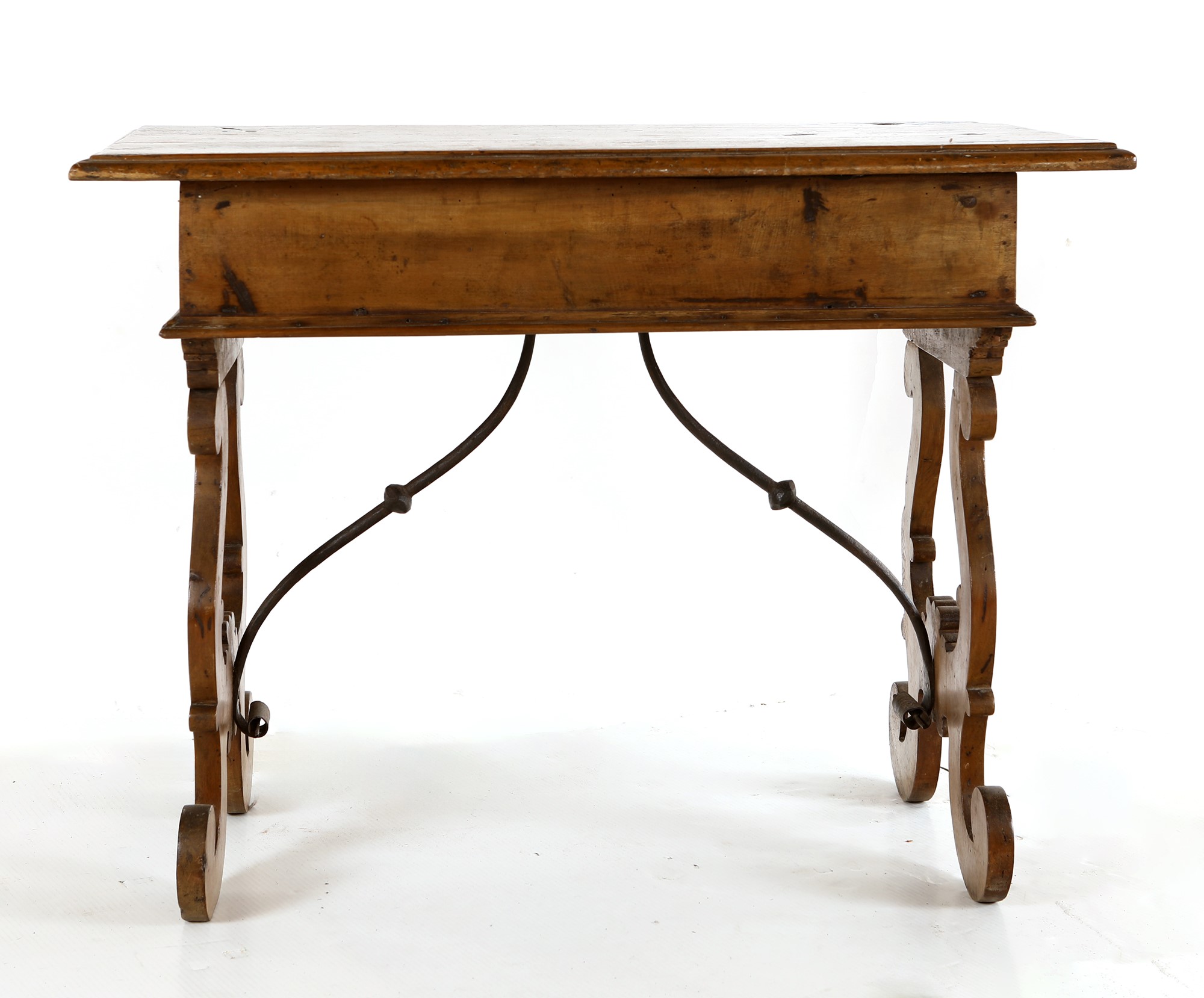 Scrittoio in noce, XVII secolo cm 78x100x60 piano rettangolare con ciglio convesso, un cassetto al centro della fascia, gambe a lira riunite sottopiano da traverse sagomate in ferro