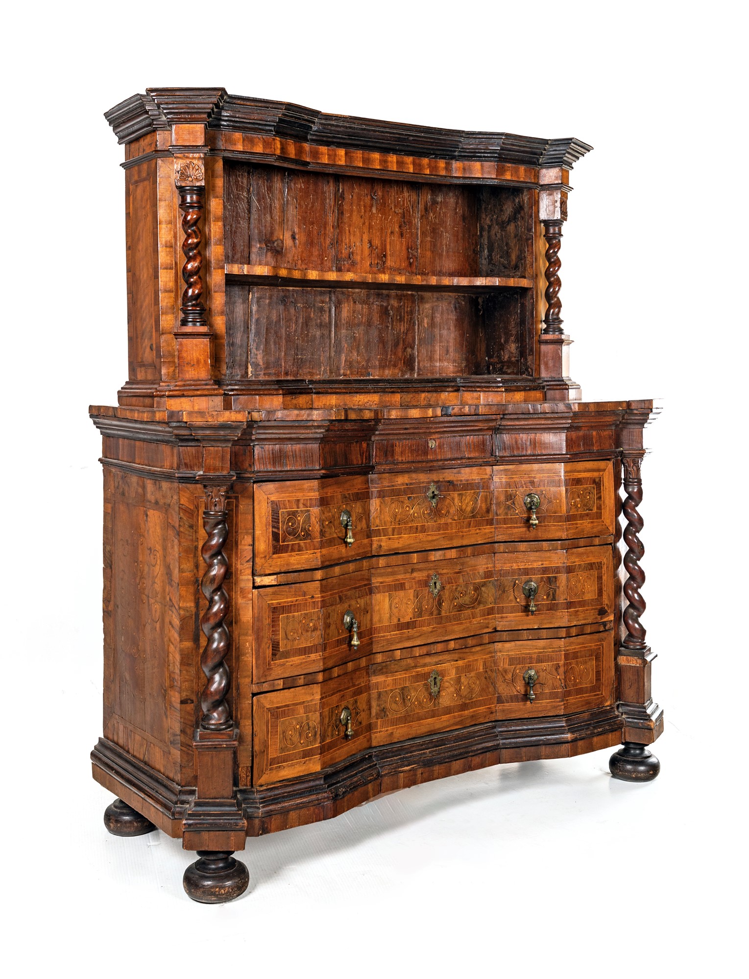 Cassettone lastronato in noce, XVII secolo cm 100x140x58,5 - alzata cm 68x125x35 decorato da sottili filettature intarsiate in legno di frutto; facciata mistilinea delimitata da colonne tortili, suddivisa in tre cassetti con maniglie pendenti in bronzo; corpo superiore con ripiani a giorno non pertinente, ma con analoghe caratteristiche