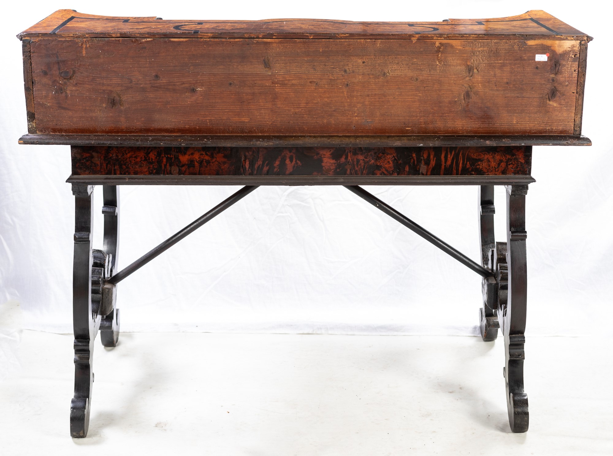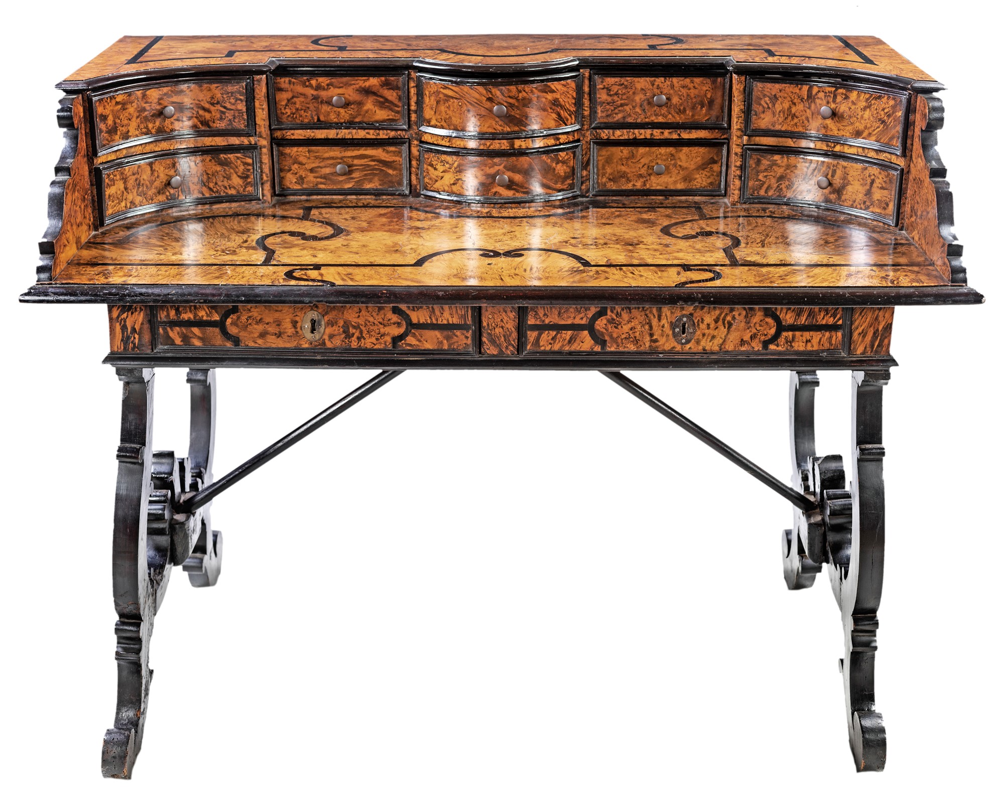 Scrivania San Filippo lastronata in radica di olmo, Lombardia, fine del XVII/inizio del XVIII secolo cm 106x136x80 con profili ebanizzati ed ampie filettature in contrasto disposte a creare riserve sagomate; piano sormontato da un'alzata con facciata mistilinea ad andamento curvilineo, suddivisa in dieci tiretti; due cassetti in linea compresi nella fascia, montanti a lira riuniti sotto piano da traverse