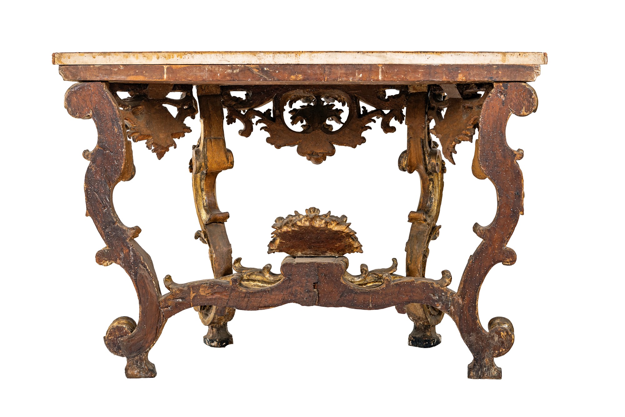 Console in legno scolpito e dorato, Roma, XVIII secolo cm 92x135x65,5 fascia centrata da ampio cartiglio costituito da volute affrontate sottese a lambrecchini, da cui si dipartono motivi vegetali posti a sottolineare la sinuosità degli elementi che fungono da sostegno; crociera di raccordo centrata da una conchiglia. Piano sagomato lastronato in marmo giallo di epoca posteriore