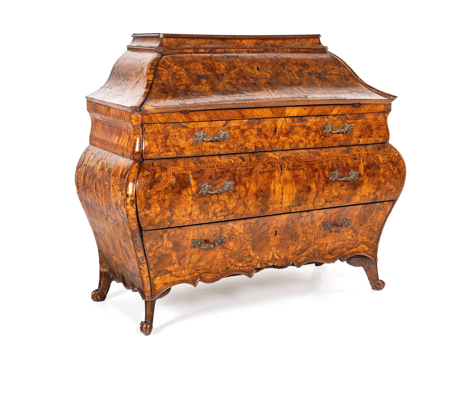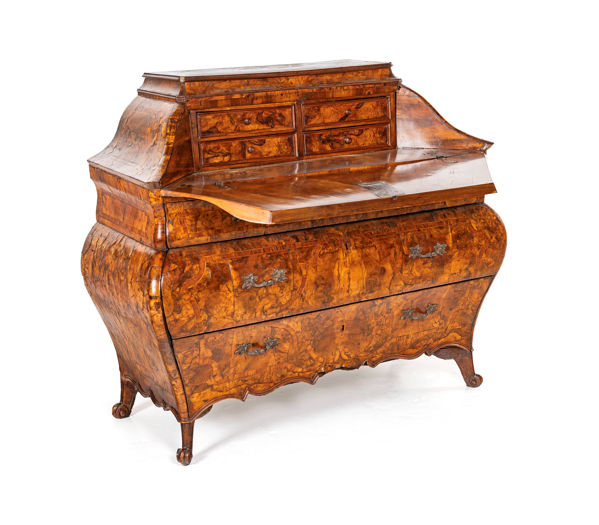 Ribalta ad urna in radica di noce, Lombardia, prima metà del XVIII secolo cm 113x130x60 corpo dalla caratteristica forma bombata, impreziosito da riserve sagomate definite da filettature intarsiate; la ribalta ospita quattro tiretti, fascia concava comprendente un cassetto, facciata suddivisa in due cassetti privi di traversa con maniglie in bronzo; spigoli curvilinei così come il grembiale sottolineato da orlo modanato; piedi sfuggenti terminanti a ricciolo. Difetti e rifacimenti. Difetti e restauri