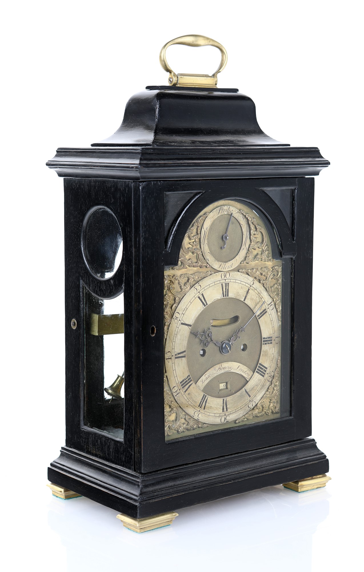 Pendola da tavolo Bracket in legno ebanizzato firmato Isaac Rogers, Londra,...