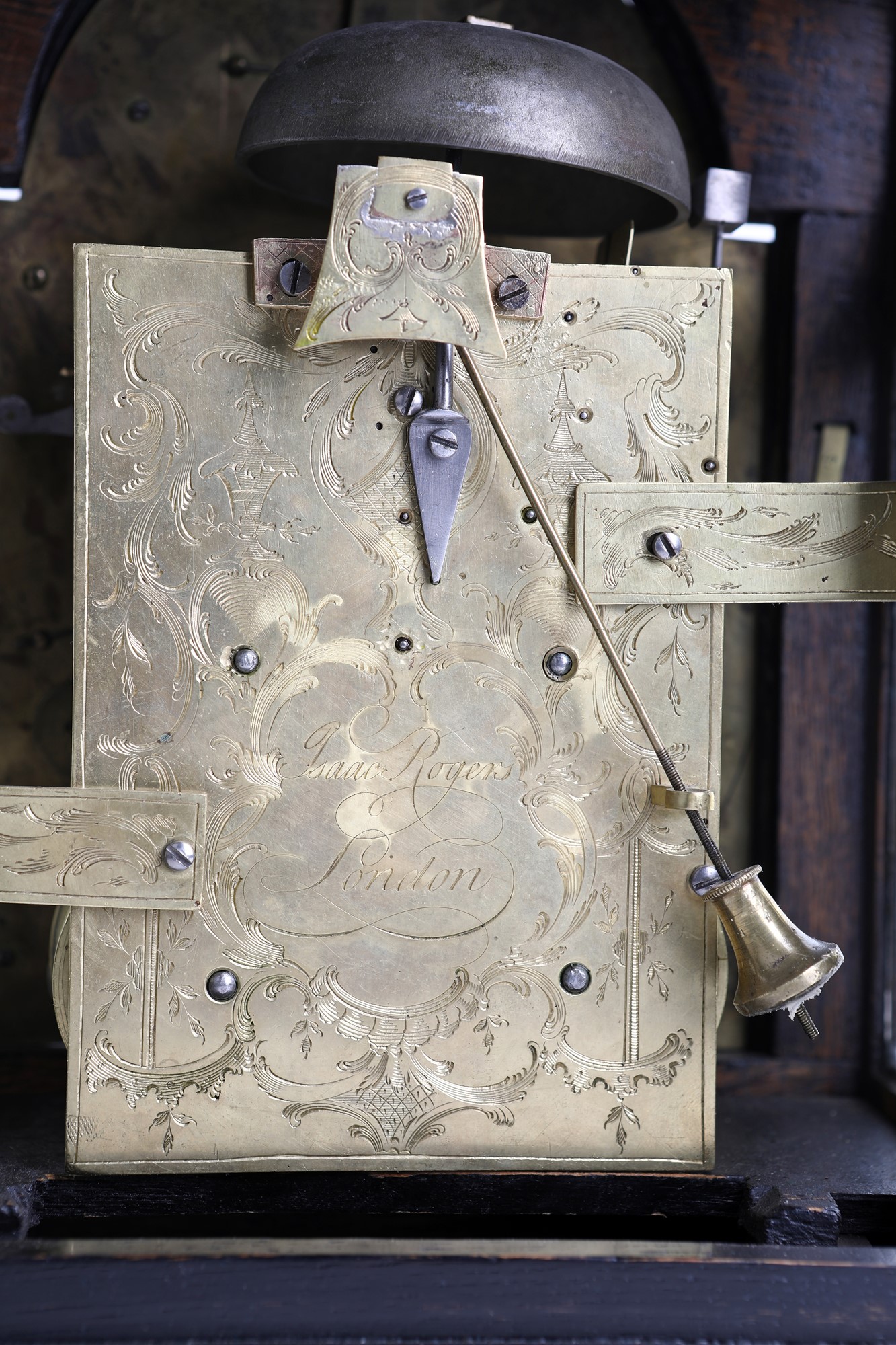 Pendola da tavolo Bracket in legno ebanizzato firmato Isaac Rogers, Londra, 1760 cm 50x27x17,5 quadrante dorato con fascia oraria argentata ed incisa a numeri romani; lancette in ferro traforate, decori applicati in bronzo dorato, apertura per il falso pendolino e finestrella per l'indicazione del giorno del mese; quadrantino per l'esclusione della suoneria. Meccanica a otto giorni, scappamento a verga, plance posteriore incisa a motivi di foglie d'acanto, firmata Isaac Rogers London; suoneria a ore e mezze al passaggio su campana