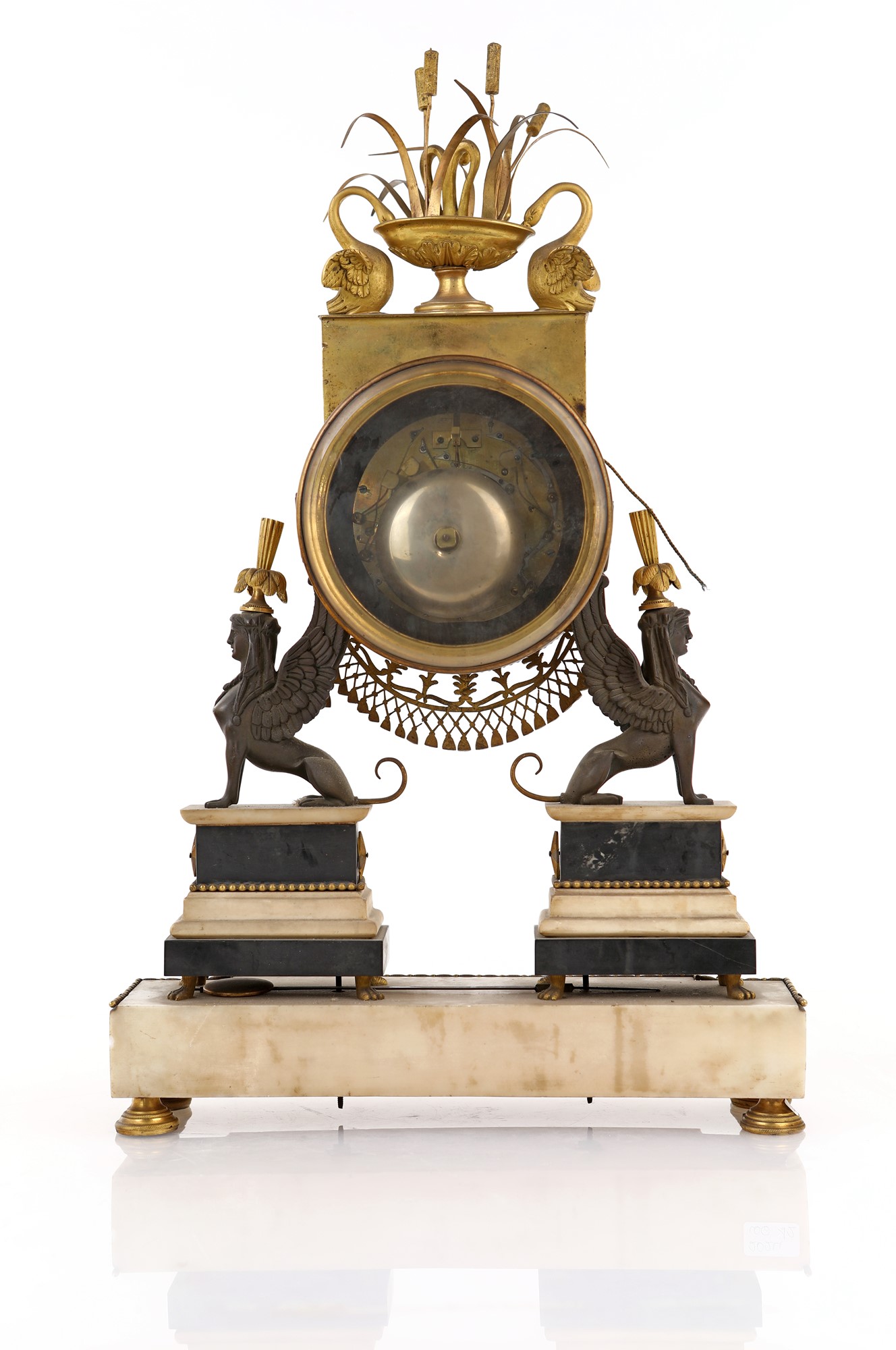 Orologio in bronzo brunito e dorato d'epoca Direttorio caratterizzato da sfingi 1790 ca. cm 54x35x11 Quadrante in smalto bianco con lancette finemente traforate e incise, firmato Perret Gentil; tre fori di carica e fascia oraria a numeri arabi; sulla sommità un basamento coronato da una coppa ricolma di vegetazione palustre affiancata da cigni; due figure di sfinge contrapposte riunite da una trina bronzea minuziosamente resa, poggiano su alti piedistalli in marmi bianco e nero impreziositi da stelle dorate e fungono da sostegno. Base rettangolare in marmo bianco su bassi piedi a plinto. Movimento svizzero a otto giorni di carica, suoneria a ore e quarti su campanelli al passaggio e a richiesta. Scappamento ad ancora e sospensione a filo. Difetti e mancanze