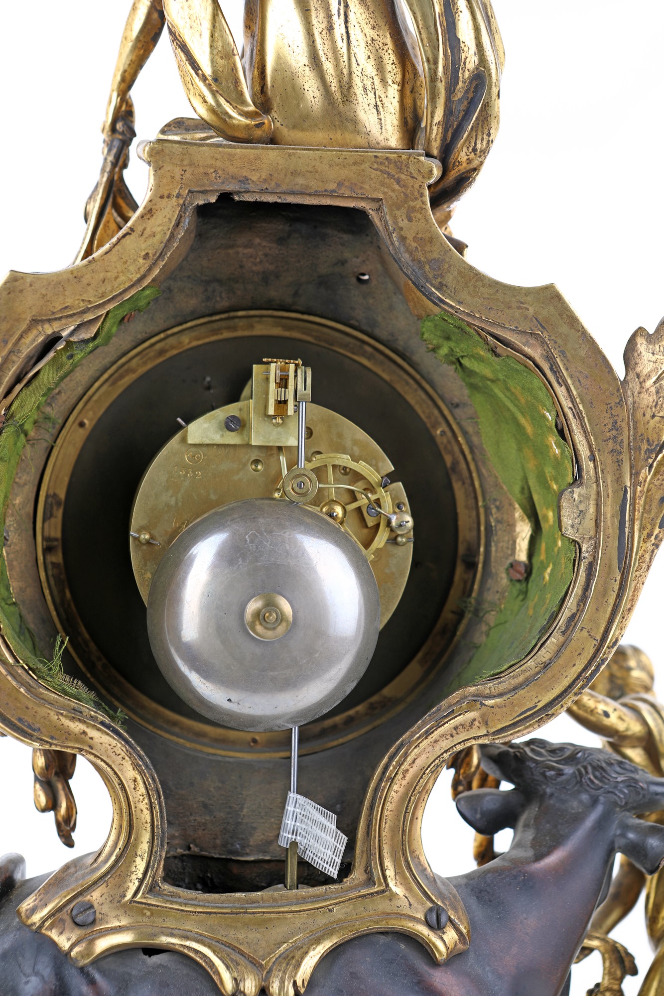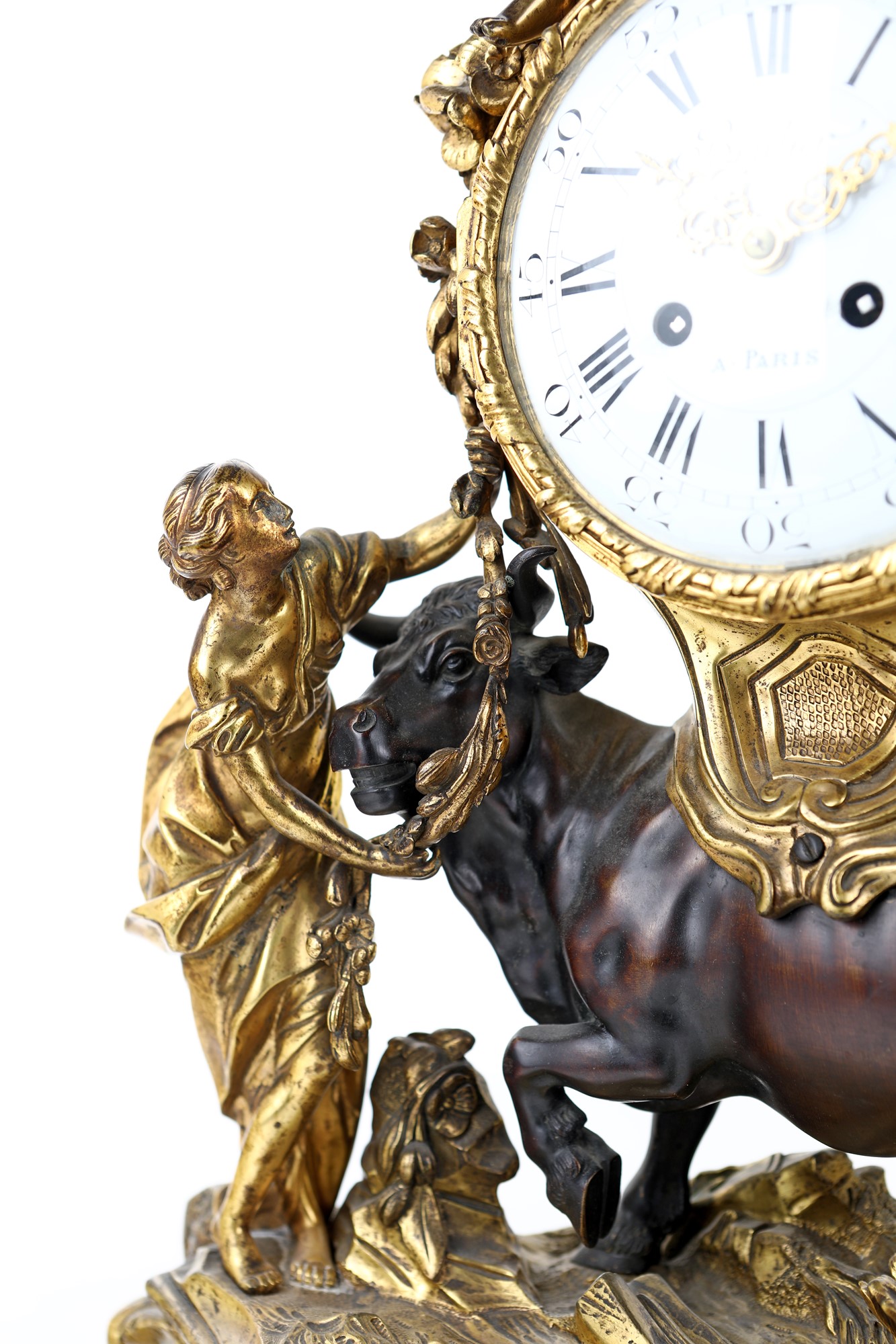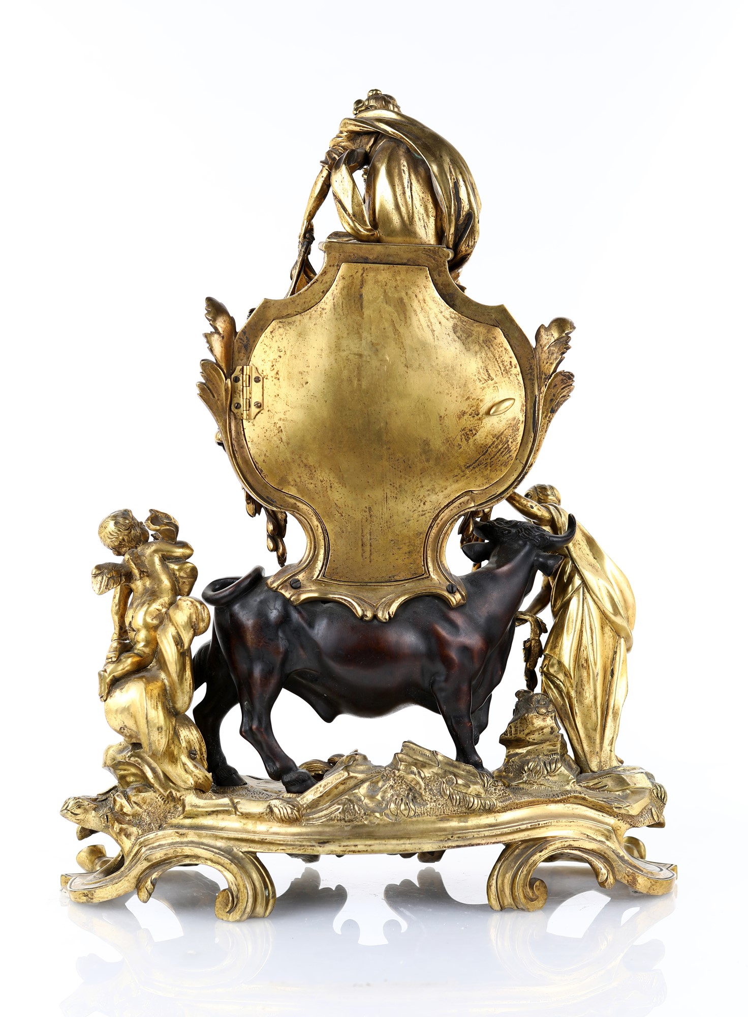 Orologio in bronzo brunito e dorato caratterizzato da "ratto di Europa", Francia, fine del XIX secolo cm 56x42x18 Orologio con quadrante in smalto bianco a firma Brulfer à Paris, sorretto da toro brunito guidato da un'ancella e sormontato da figura di Europa; un amorino completa la scena; base a rocaille. Meccanismo a otto giorni di carica, suoneria a ore e mezze al passaggio su campanello, scappamento a Broccot e sospensione a lamella. La firma Brulfer Paris sul quadrante evoca la dinastia parigina di orologiai iniziata a metà del XVIII secolo e il cui unico membro Louis Brulfer è elencato in Faubourg Saint-Denis intorno al 1800-1830