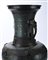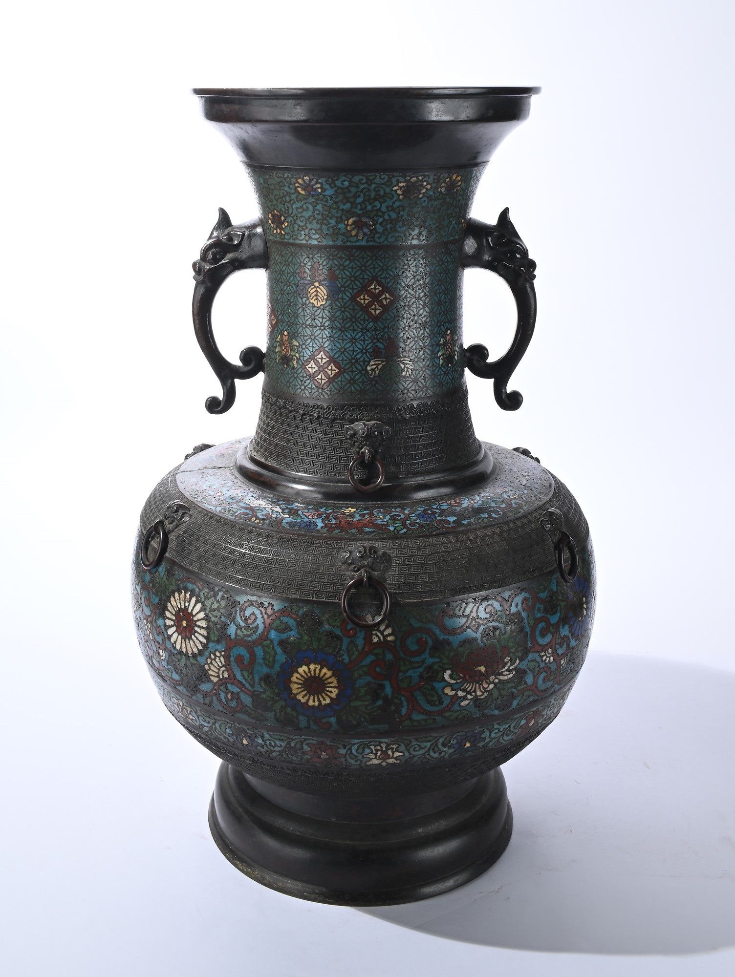 Vaso in bronzo brunito e smalti champlevé, Giappone, fine del XIX secolo altezza cm 61 corpo sferico decorato a fiori e impreziosito da anelli pensili disposti lungo la circonferenza e ripetuti alla base del lungo collo cilindrico con estremità a tromba; ai lati anse zoomorfe stilizzate, basso piede circolare