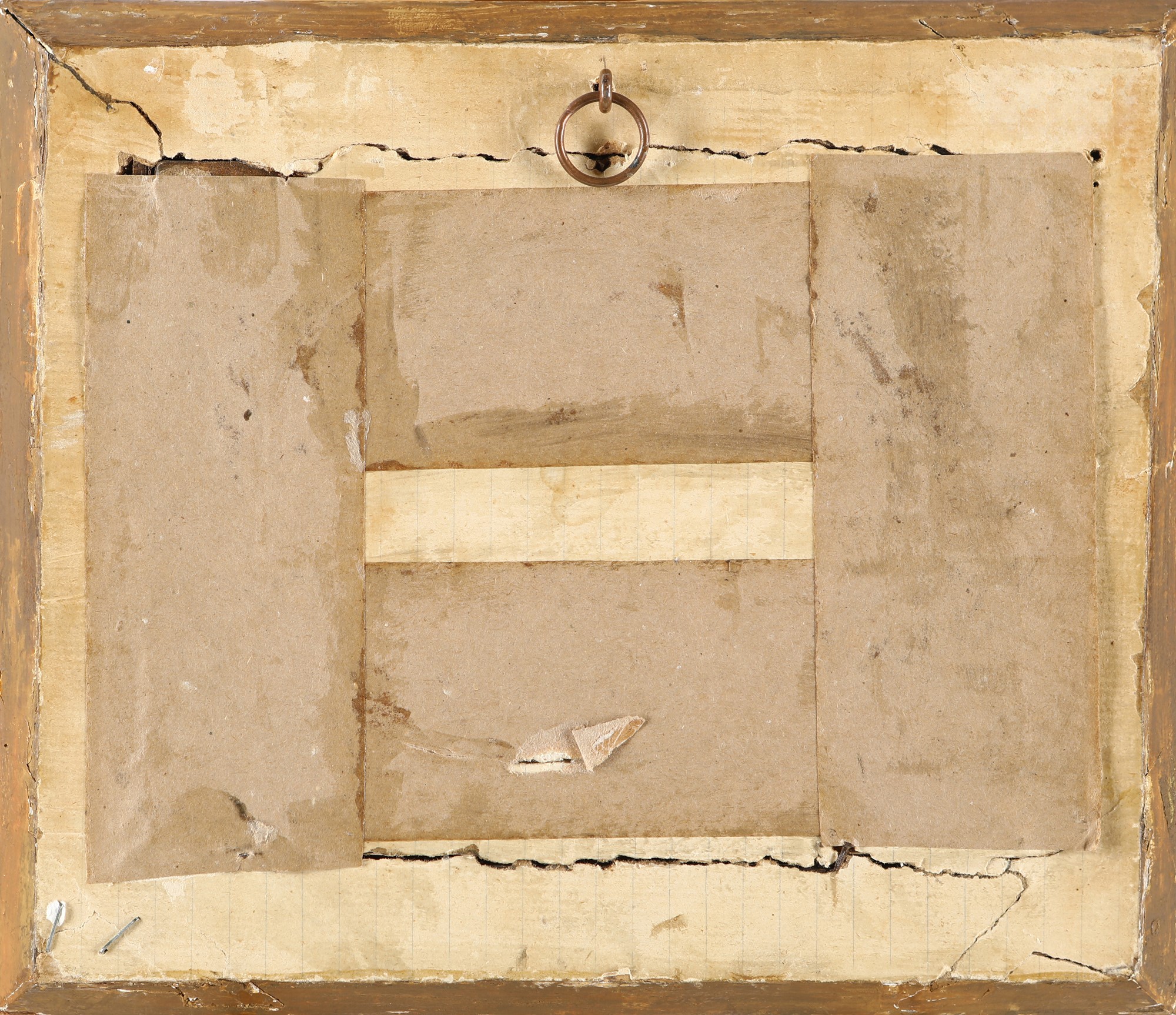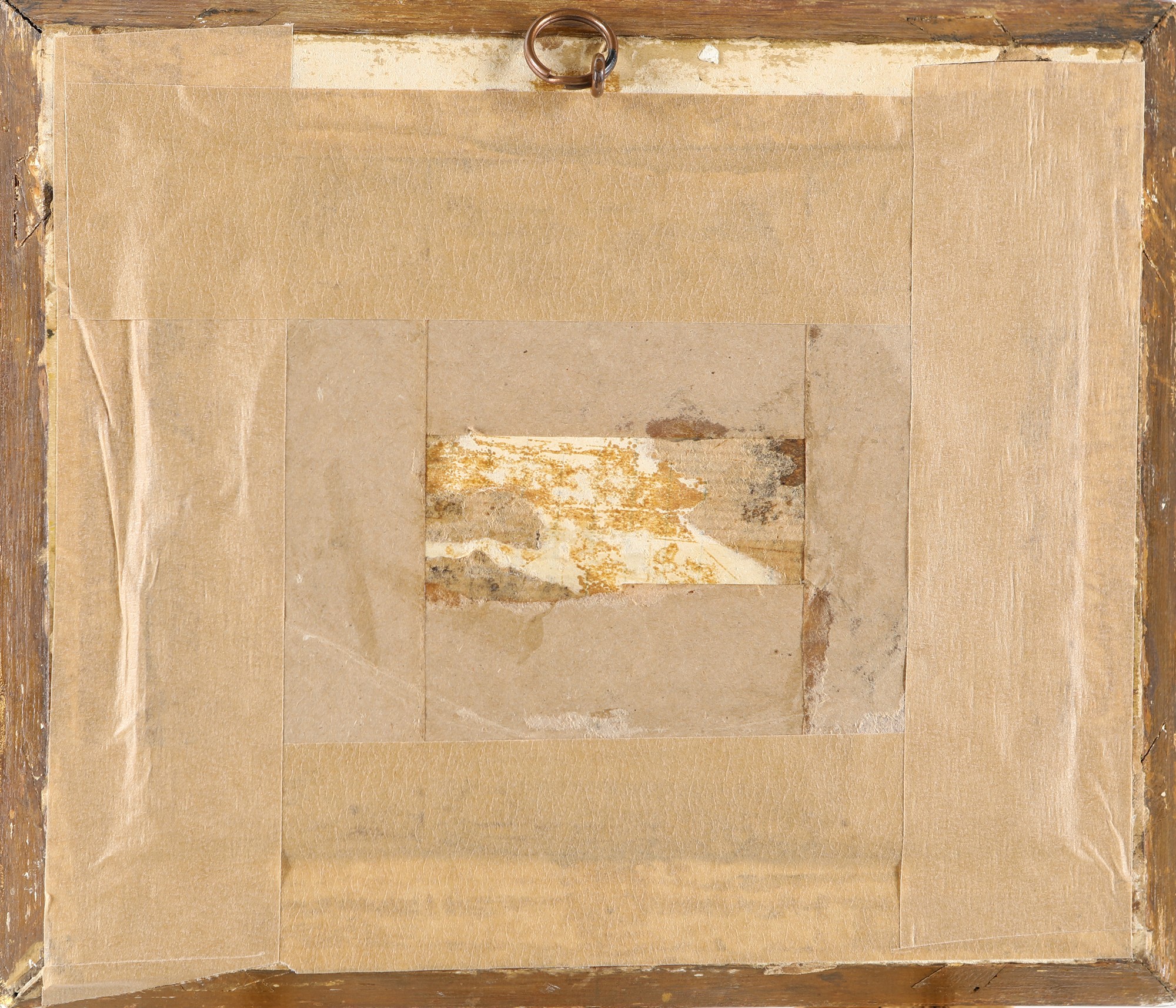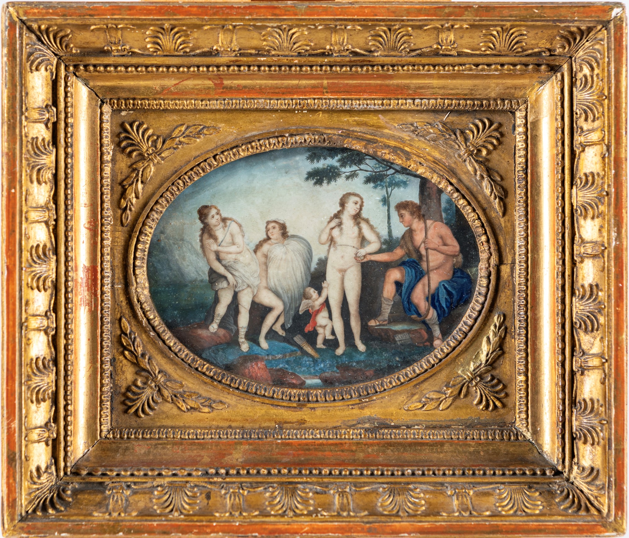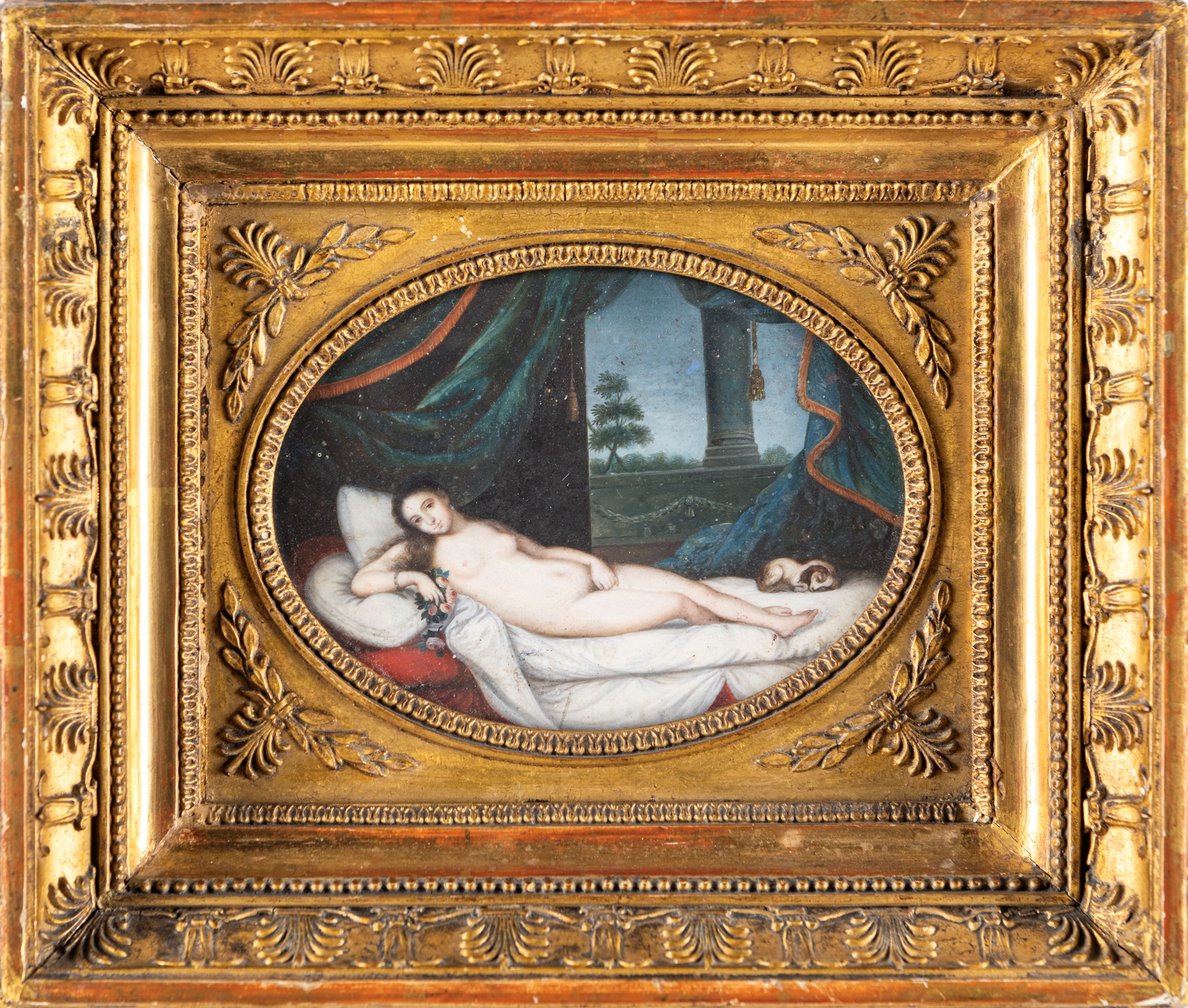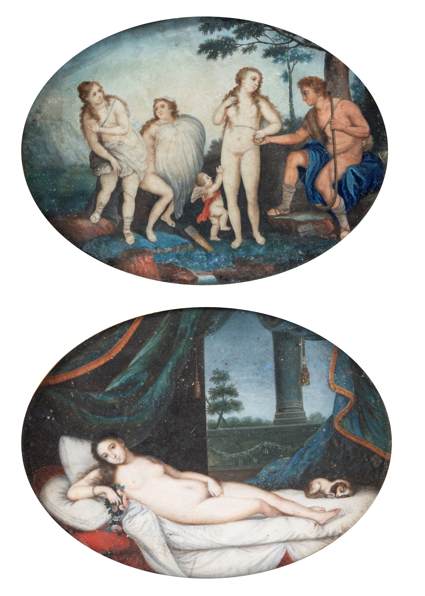 Miniaturista del XVIII secolo a) Giudizio di Paride b) Venere di Urbino (da Tiziano Vecellio) coppia di miniature ovali eseguite a tempera cm 10,7x14,8- in cornice cm 22x26 Cornici in legno dorato con minuziosa decorazione a palmette in pastiglia