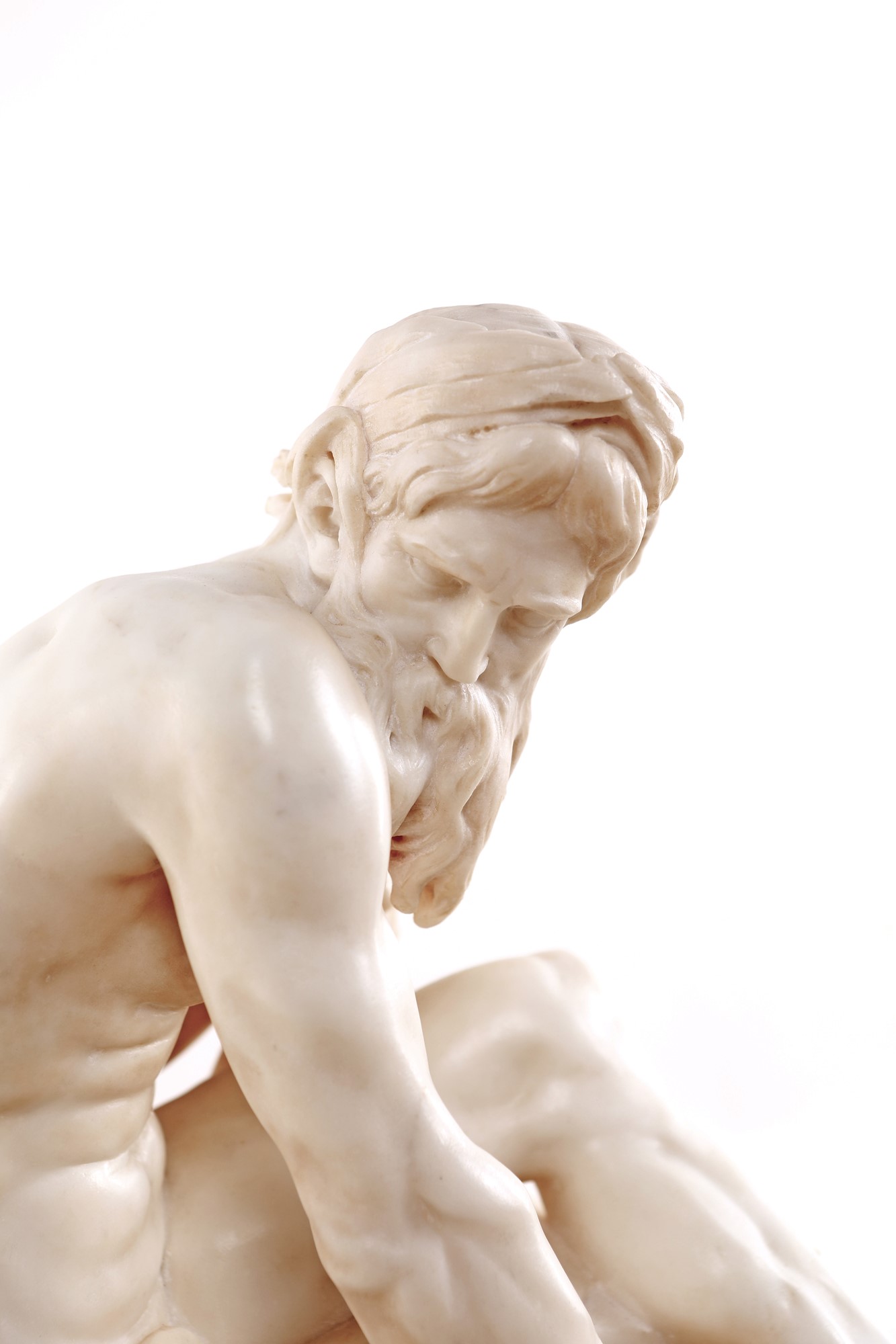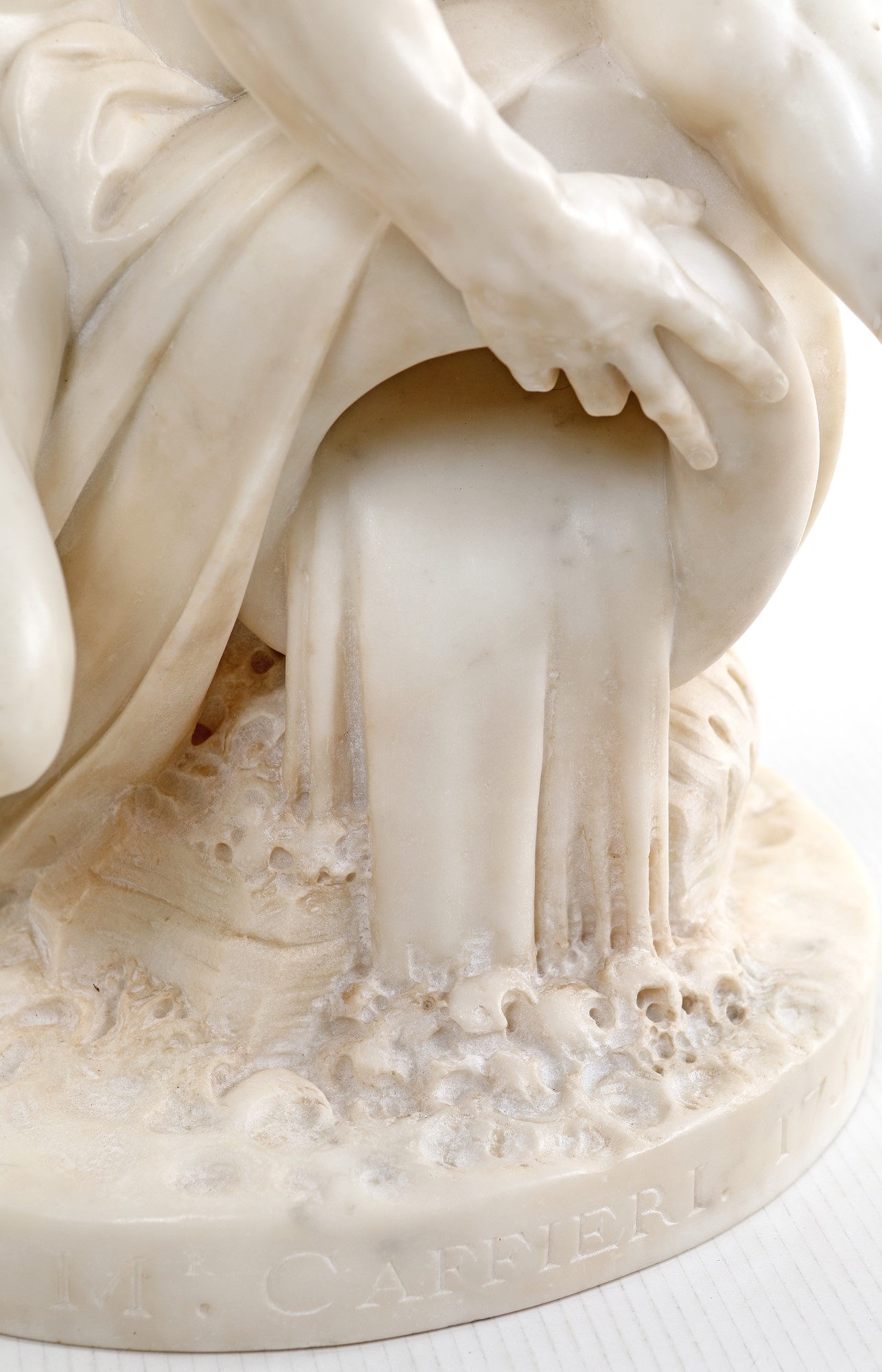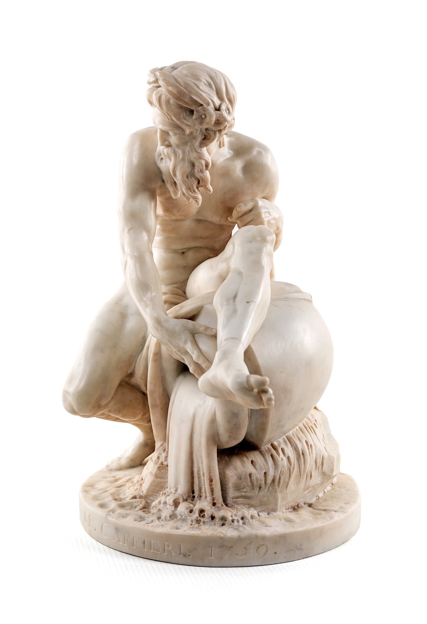 Jean Jacques Caffieri (bottega di) Divinità fluviale marmo bianco altezza cm 64 dall'originale custodito al Louvre a Parigi. Iscritto sulla base: par M.r Caffieri 1759. Jean Jacques Caffieri è conosciuto per i suoi busti-ritratto in terracotta e in marmo: i busti di Pierre Corneille e Jean Racine per il foyer della “Comédie Française” ed il busto di Madame du Barry al Museo dell'Ermitage a San Pietroburgo. Sua anche la ringhiera delle scale del Palais Royal.