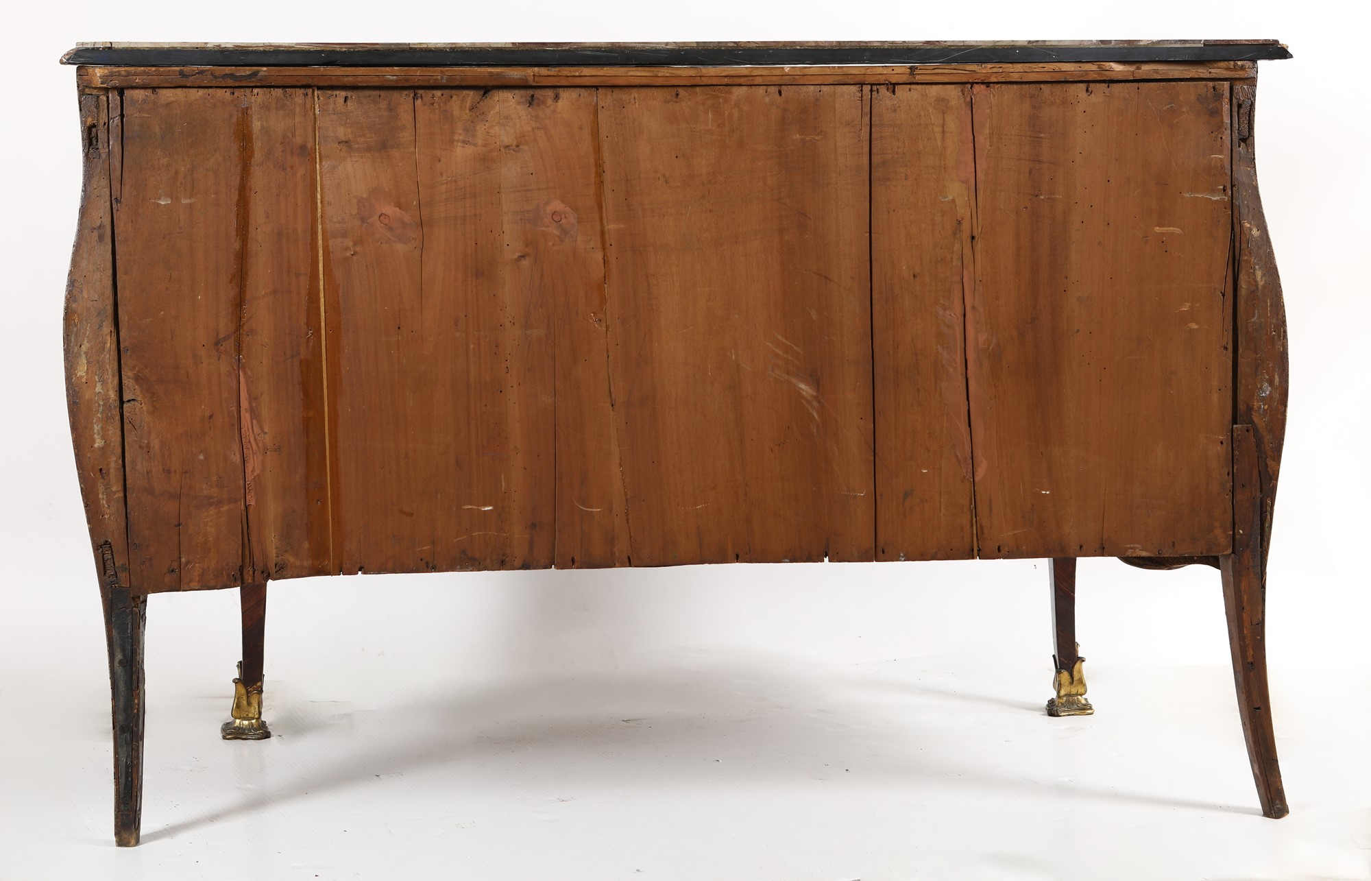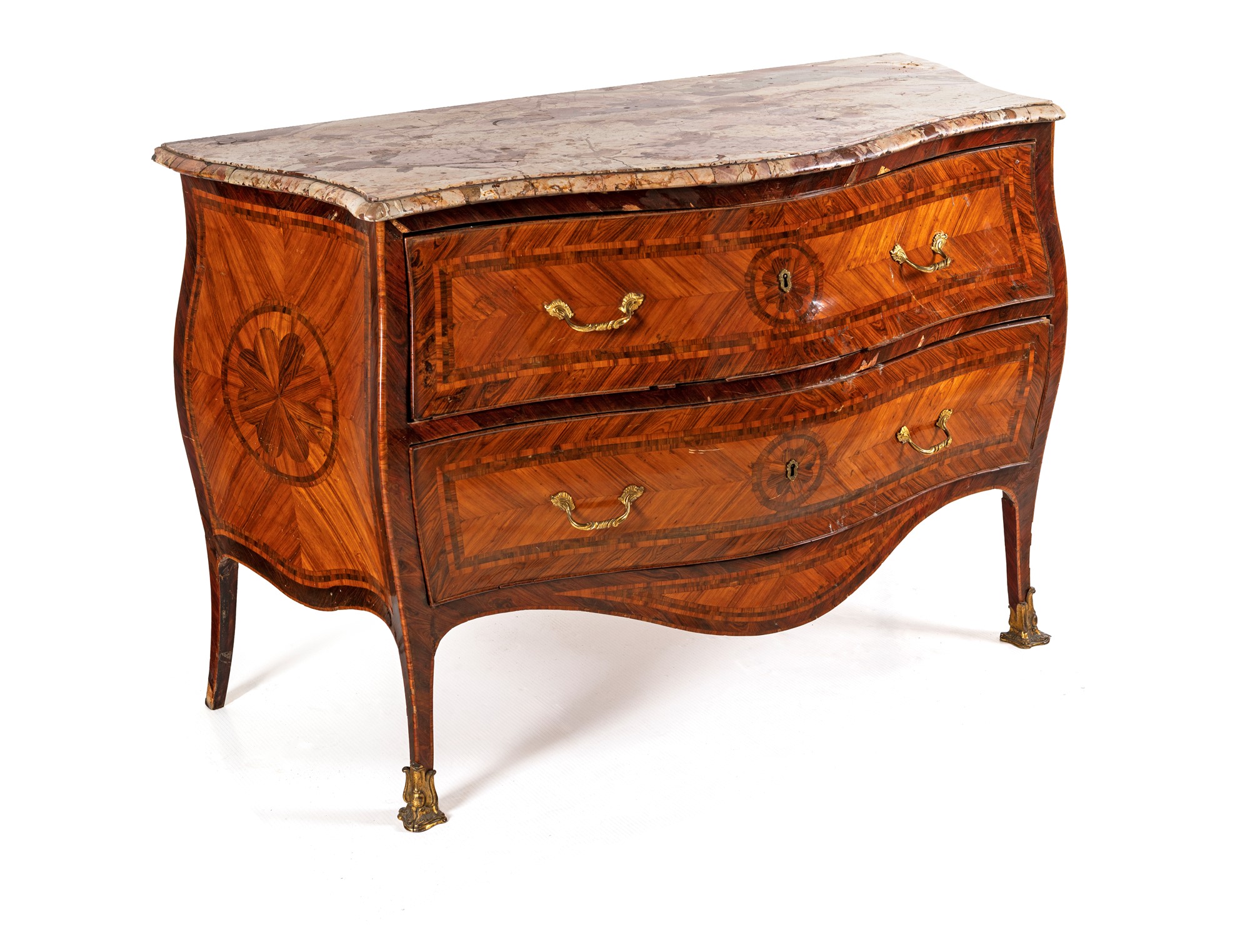 Cassettone lastronato in ebano viola e legno di rosa, Napoli, metà del XVIII secolo cm 93x141x70 caratteristica forma sagomata definita da spigoli curvilinei, con specchiature a fibre contrapposte centrare da quadrifogli; rifinito superiormente da piano in marmo, reca due cassetti frontali con maniglie in bronzo; piedi sfuggenti, quelli anteriori calzati da scarpette in bronzo