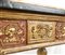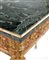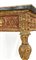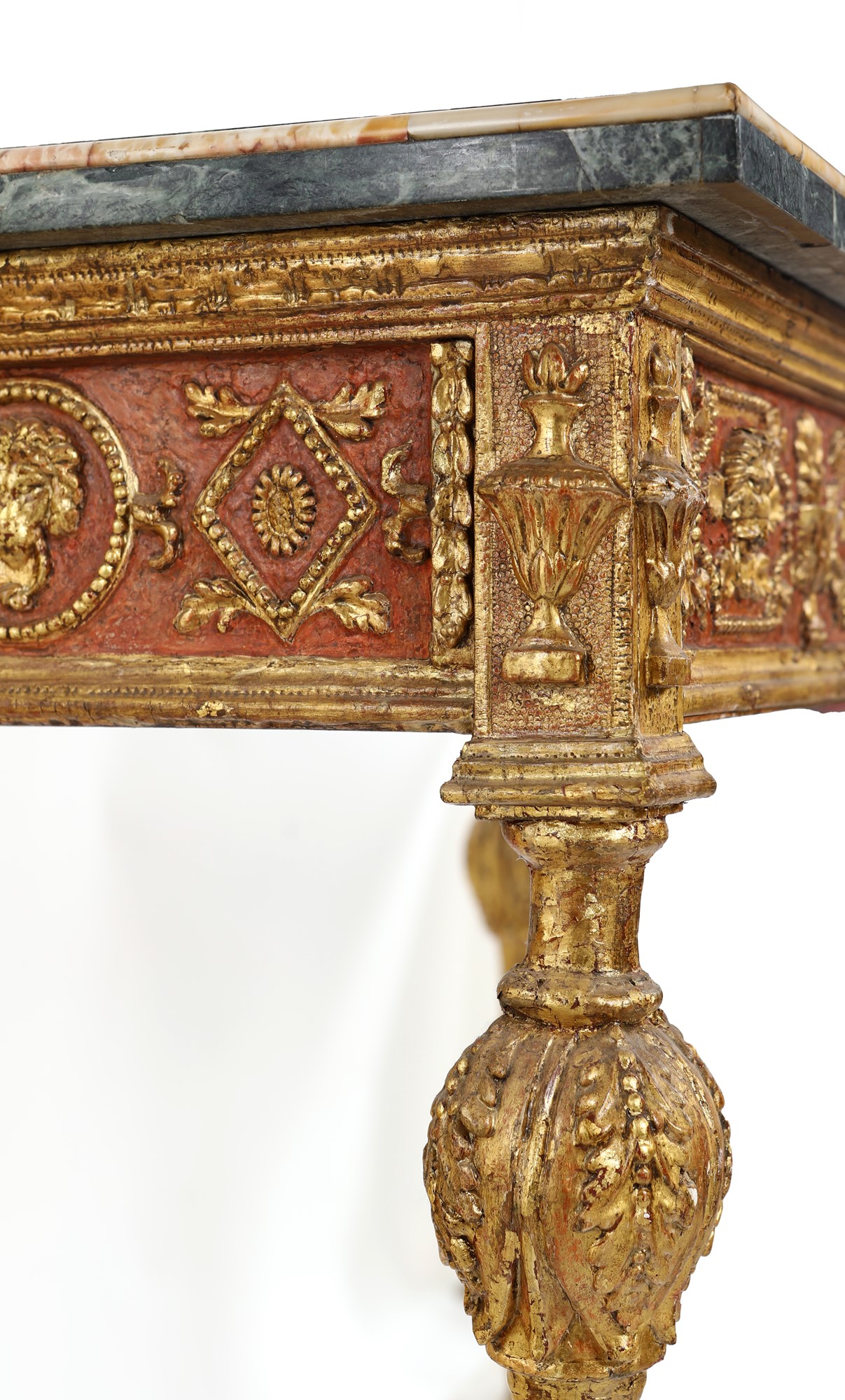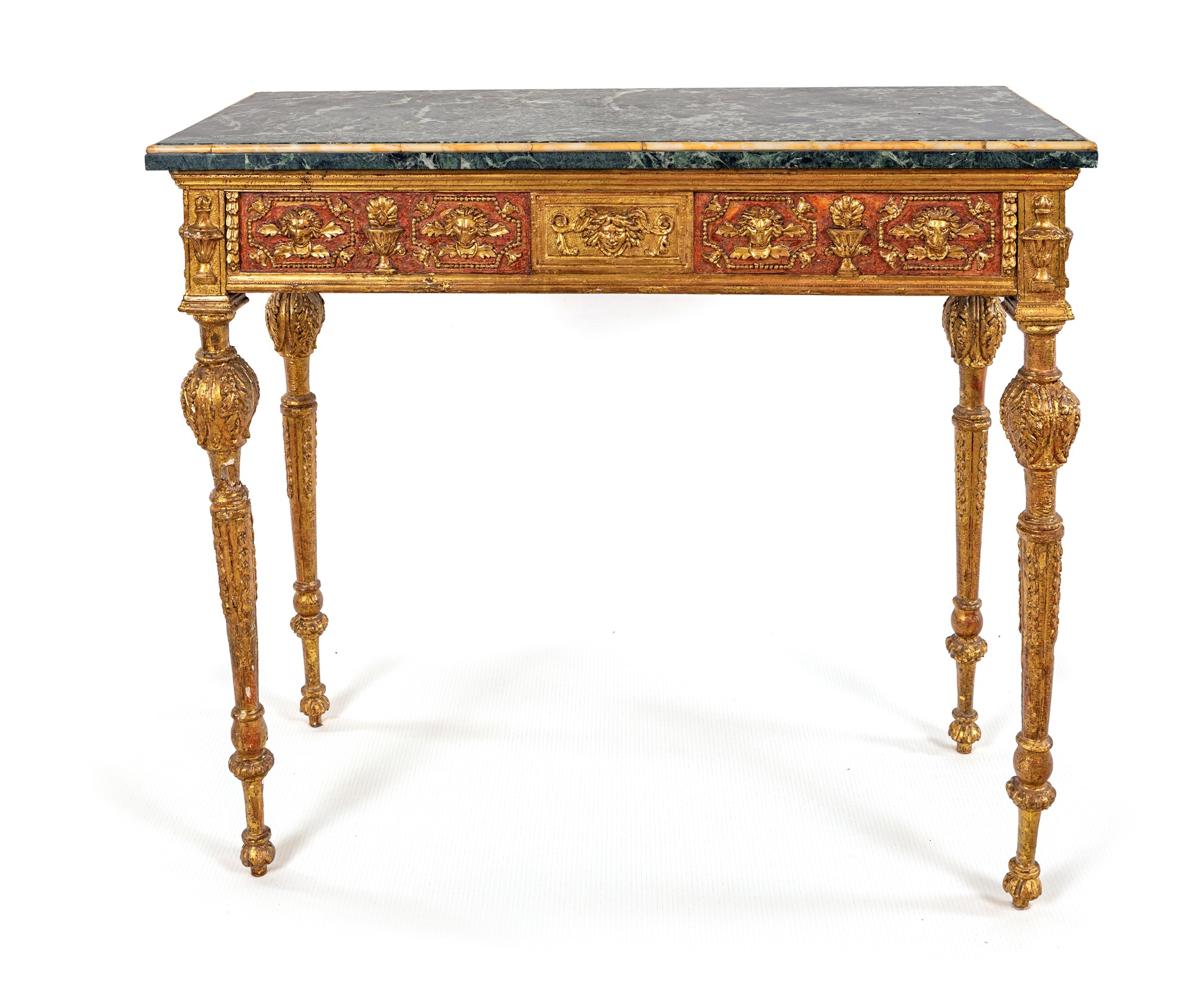 Tavolo da centro in legno laccato e dorato, XIX secolo cm 97x107x50 piano rettangolare in marmo verde con ciglio giallo, fascia lineare percorsa da rilievi dorati in forma di grottesche, mascheroni zoomorfi e vasi classici racchiusi da perlinature su fondo rosso, gambe rastremate composite. Difetti e restauri