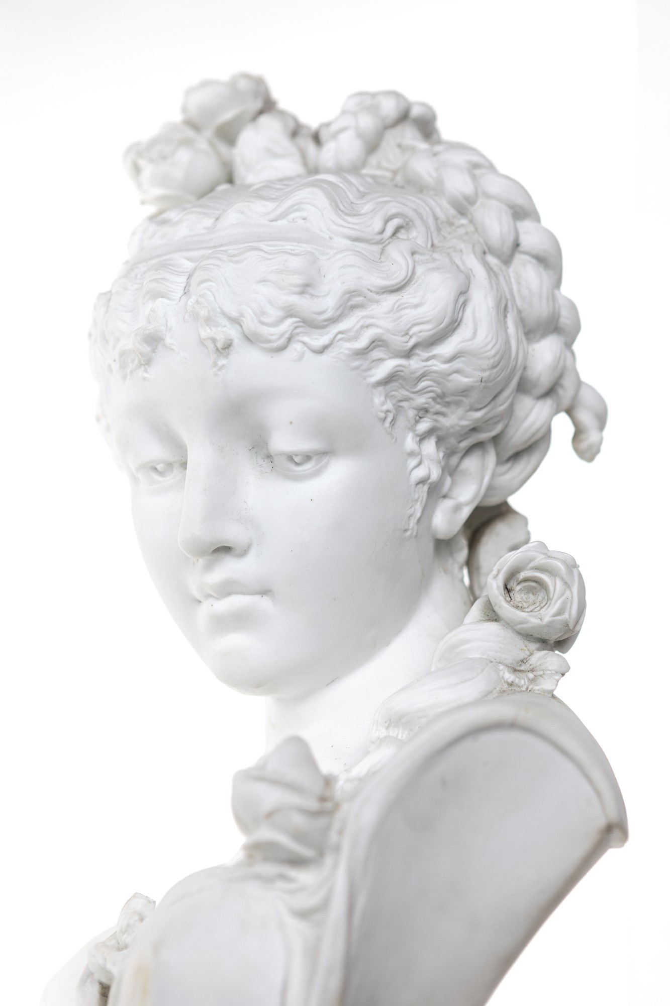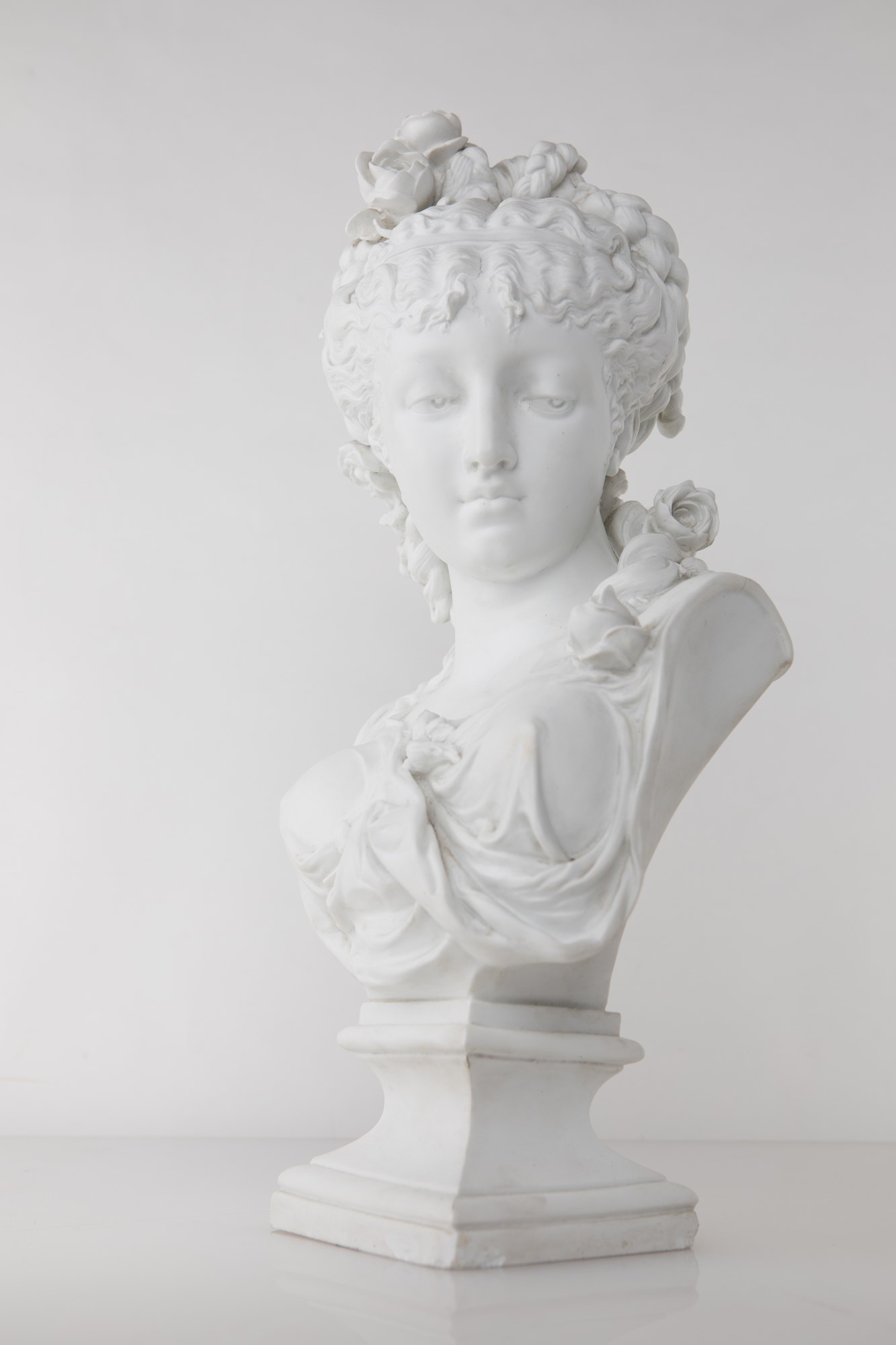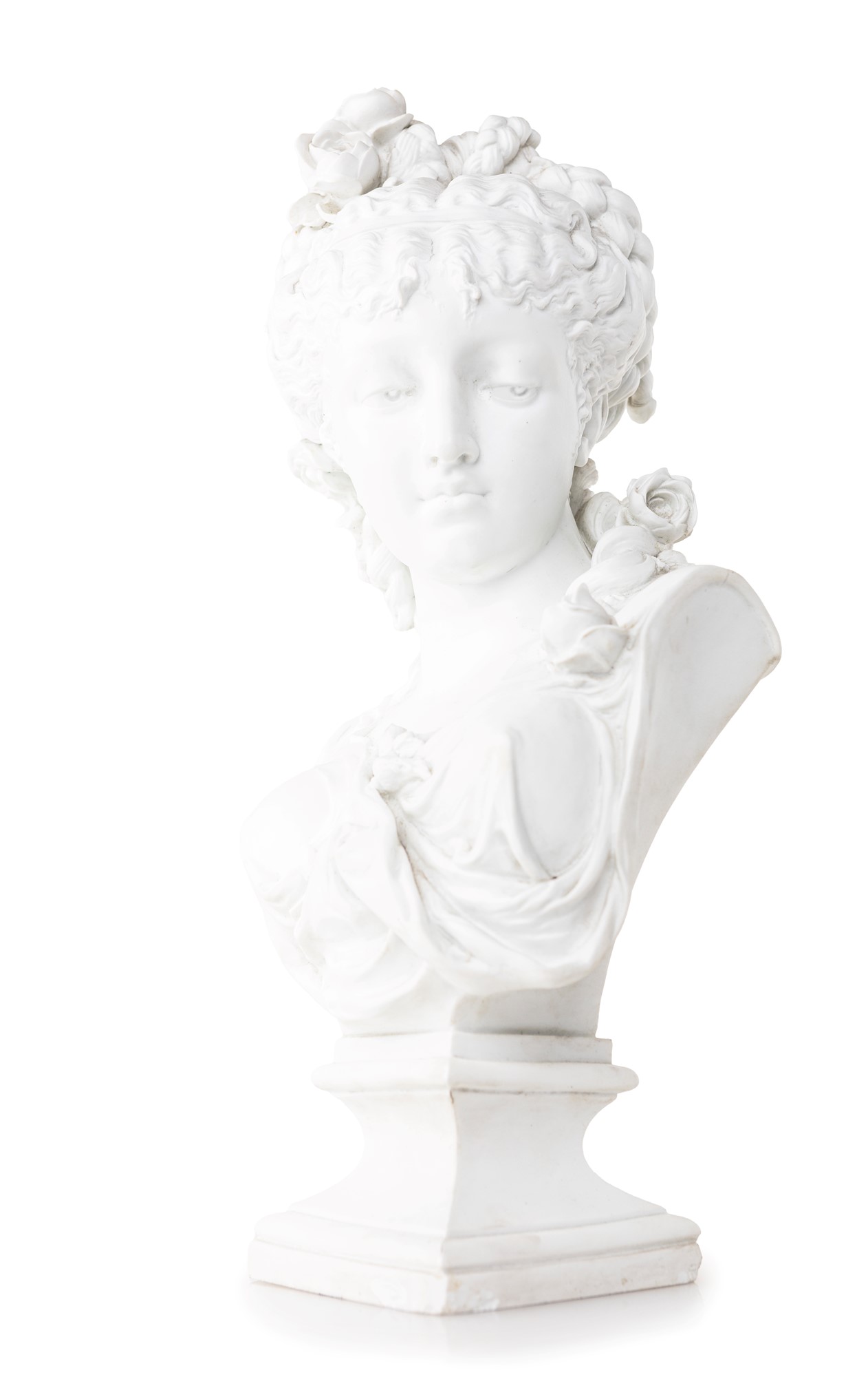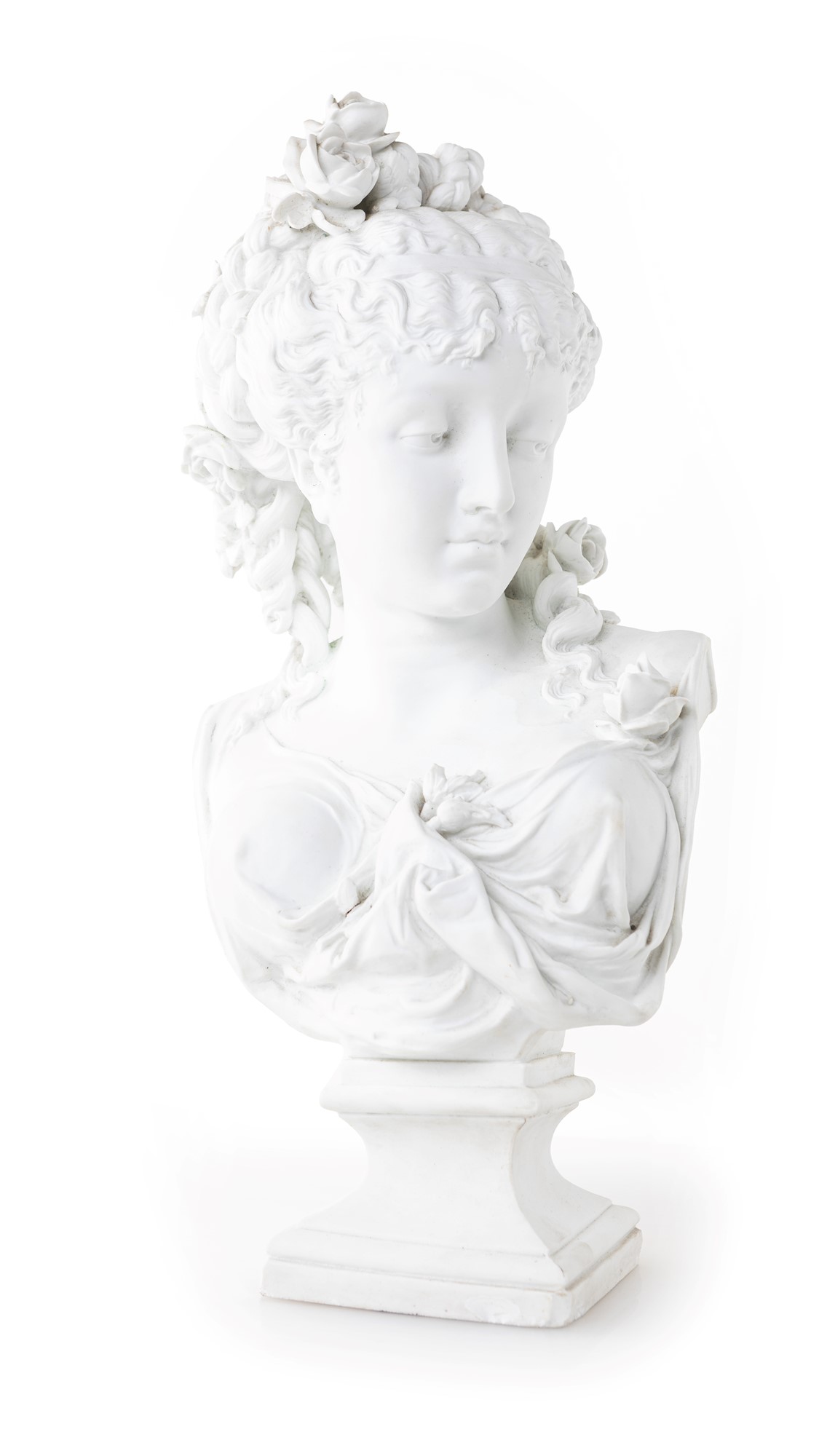 Paul Duboy Busto di Flora biscuit altezza cm 52 Firma incussa al verso: Paul Duboy. La giovane è ritratta con la testa rivolta verso la spalla sinistra, lo sguardo schivo orientato verso il basso; la veste leggera drappeggiata e trattenuta da fiori, elemento decorativo ripreso sulla capigliatura, parzialmente raccolta in trecce annodate sulla testa da cui ricadono ciocche avvolte in boccoli; piedistallo a rocchetto squadrato