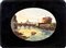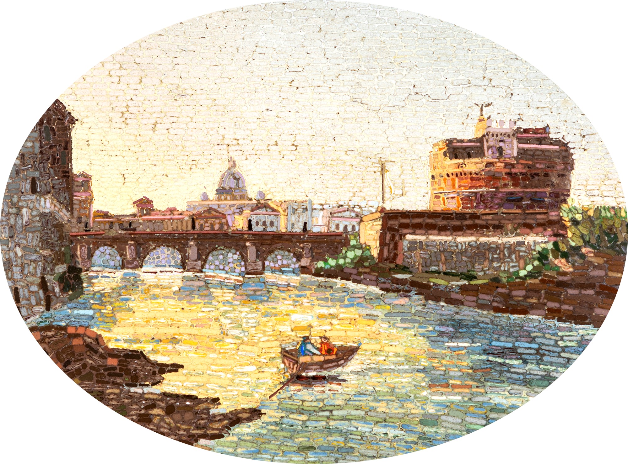 Placca in marmo nero con mosaico minuto raffigurante veduta di Roma, seconda metà del XIX secolo cm 2x17,5x13 - placca musiva cm 12x8,8 del Tevere con piccola imbarcazione, la Mole Adriana, ponte Sant'Angelo e la Basilica Vaticana in lontananza