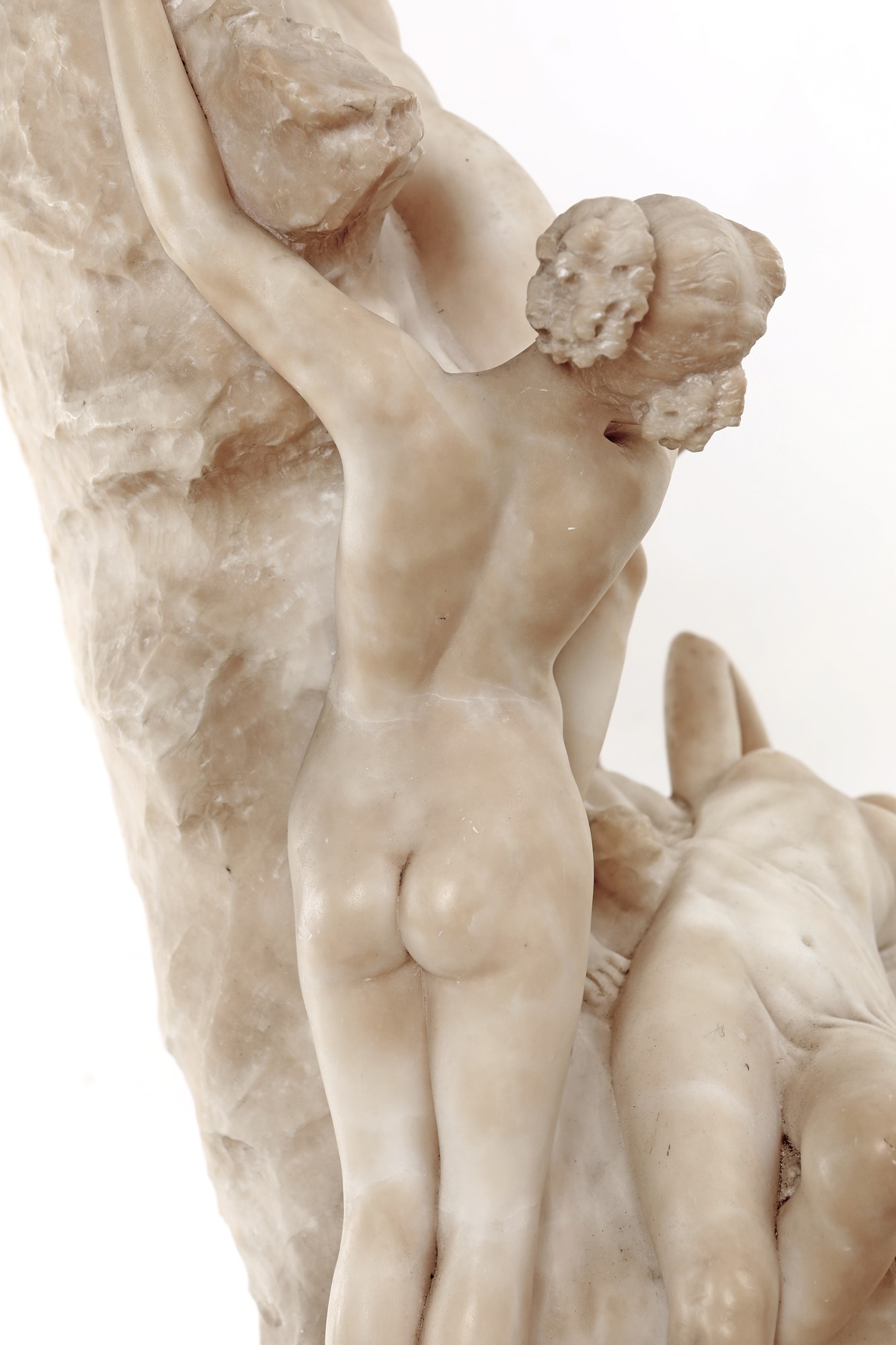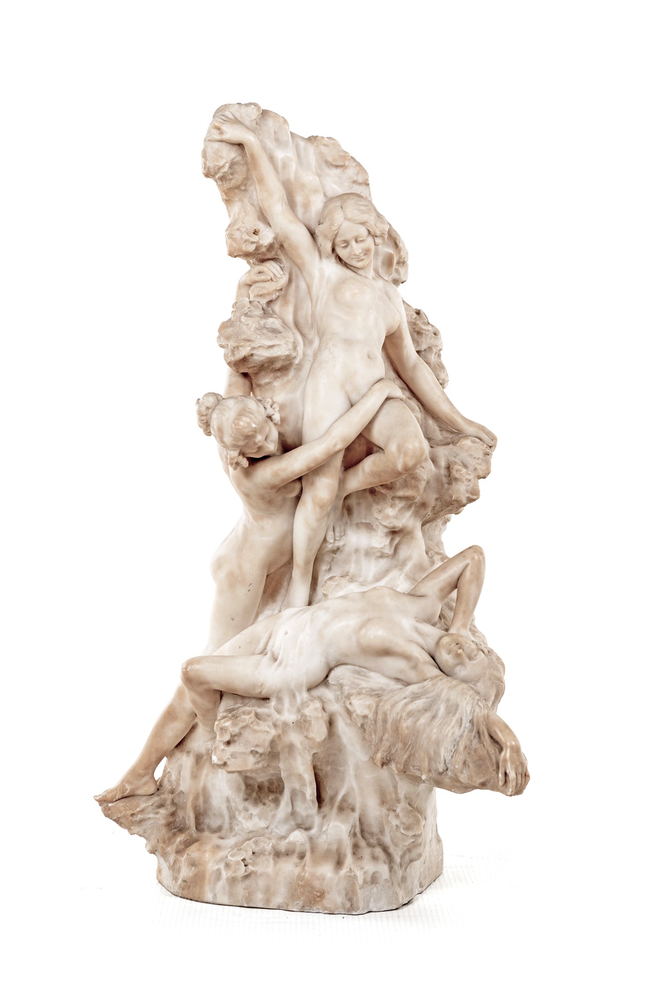 Scultore francese, fine del XIX/inizi del XX secolo Allegoria della Bellezza marmo bianco altezza cm 93 Gruppo scultoreo raffigurante tre giovani naiadi ritratte in movenze lascive su un costone roccioso