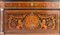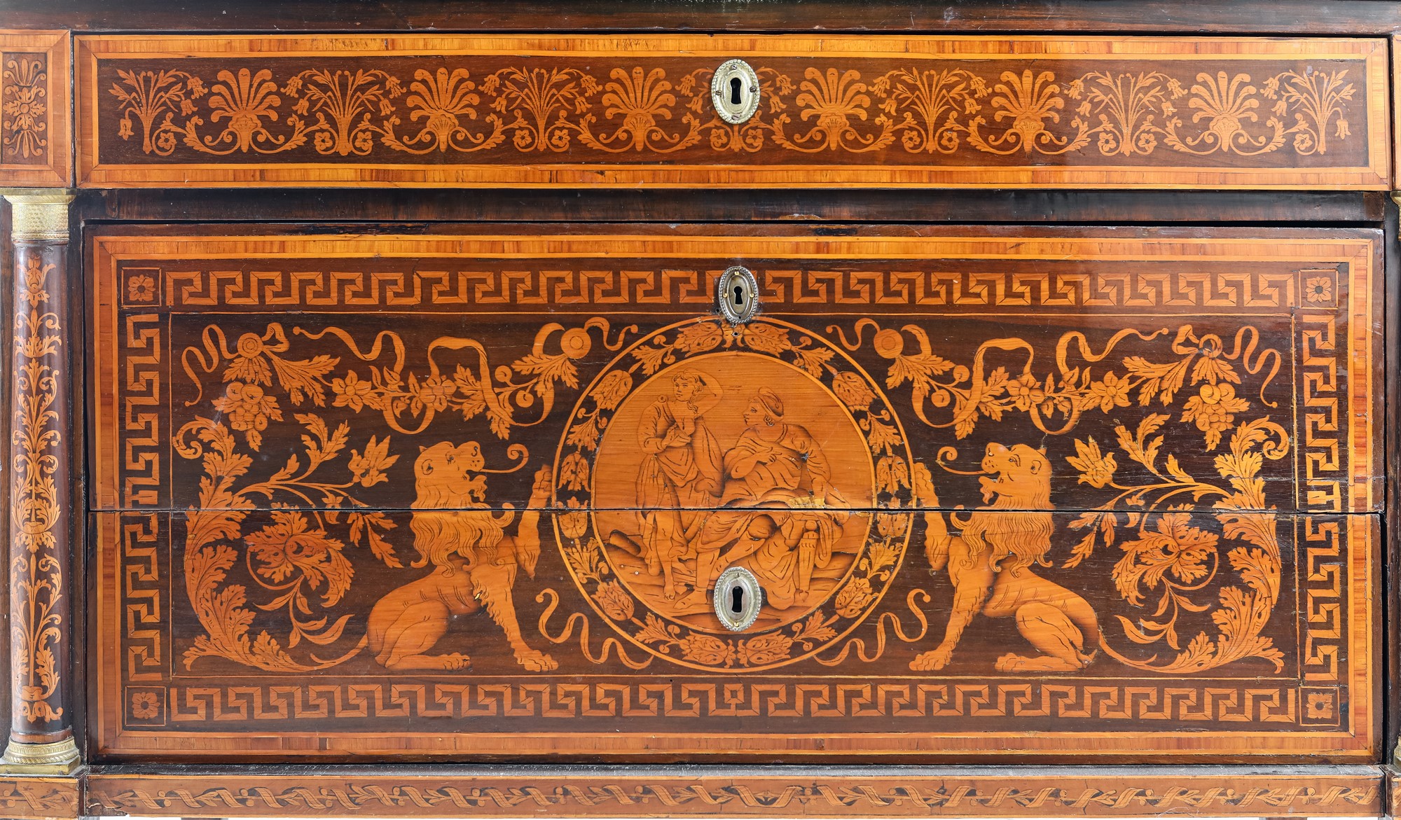 Cassettone in noce intarsiato con specchiera en suite, XIX secolo cm 92,5x126x58,5 e cm 135x108 decorati da tarsie di gusto neoclassico su ogni partizione: la facciata del cassettone è racchiusa da una greca e reca al centro un grande medaglione con figure pirografate racchiuso da una ghirlanda fiorita; ai lati figure di leone, girali fitomorfe con corolle multiformi e nastri svolazzanti; i fianchi, incorniciati da girali, sono centrati da grandi coppe biansate idealmente poggiate su cespi vegetali incorniciati da festoni e nastri; cascatelle fiorite impreziosiscono le lesene laterali e i pilastri; un cassetto nella fascia percorso da cespi alternati a palmette e due sottostanti privi di traversa delimitati da lesene semicircolari con finiture in bronzo cesellato e dorato; piedi rastremati. La specchiera dalle analoghe caratteristiche stilistiche e decorative, è caratterizzata da una cornice a più ordini di tarsie a motivi lineari, geometrici e fitomorfi