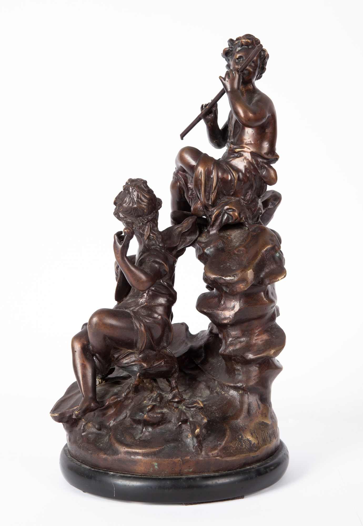 Scultore francese del XIX secolo Fanciulli suonatori (nei modi di Claude Michel Clodion) lega metallica patinata altezza cm 36x19 Firma non interamente decifrabile sulla base: F. M...