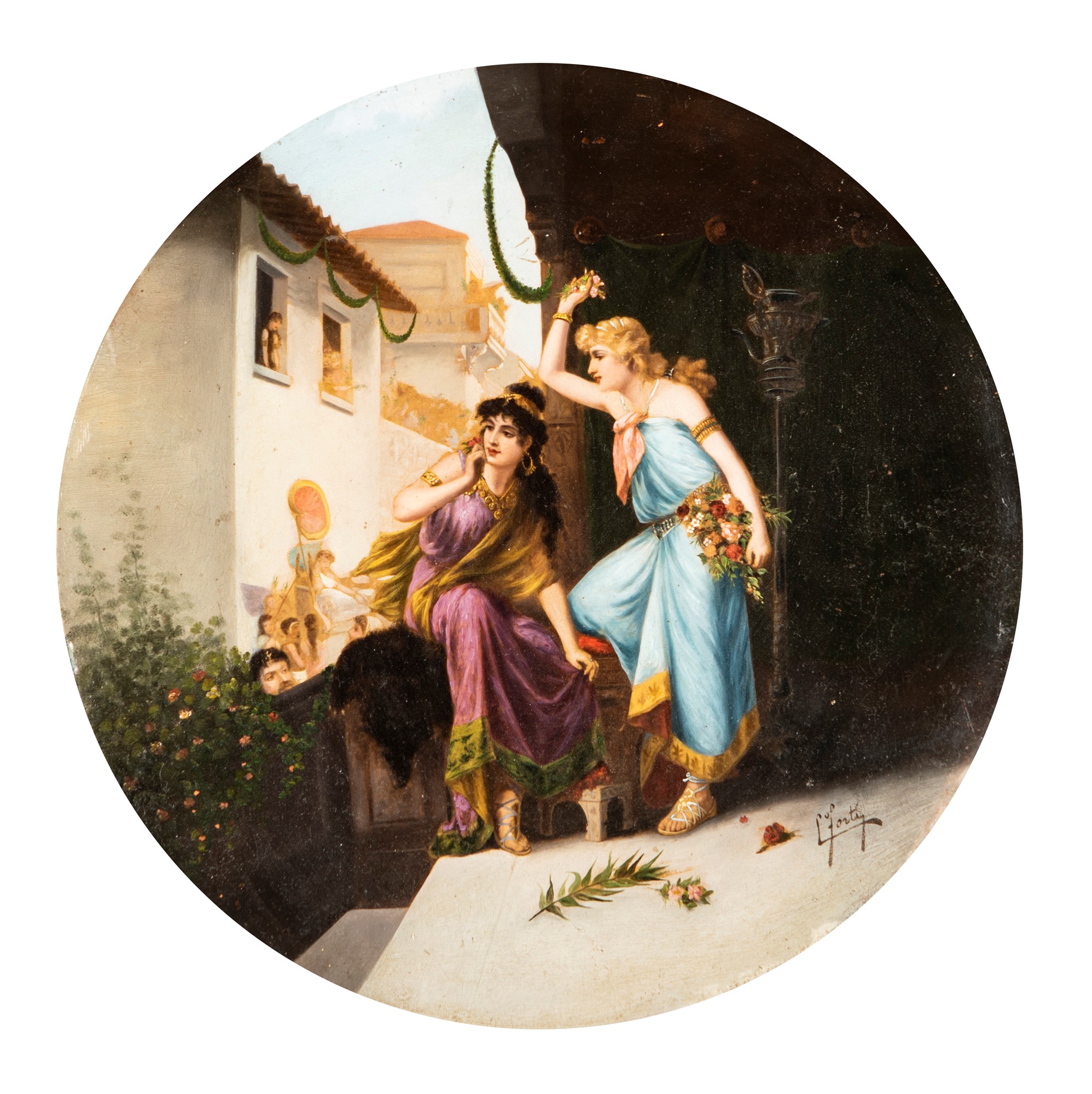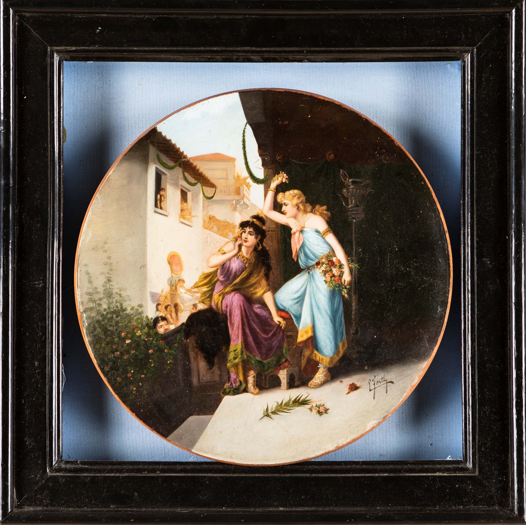 Edoardo Ettore Forti Figure pompeiane terracotta dipinta diametro cm 37 - in cornice cm 52x52 Firmato in basso a destra: E. Forti. Entro cornice quadrangolare in legno laccato nero. Edoardo Ettore Forti è autore di dipinti di genere neo pompeiano, attivo nella Roma tra la fine del XIX e l’inizio del XX secolo. La sua pittura è tutta incentrata sulla riproduzione di ambientazioni antiche sulla scia del successo ottenuto da Sir Lawrence Alma-Tadema (1836-1912) dopo i ritrovamenti di Pompei