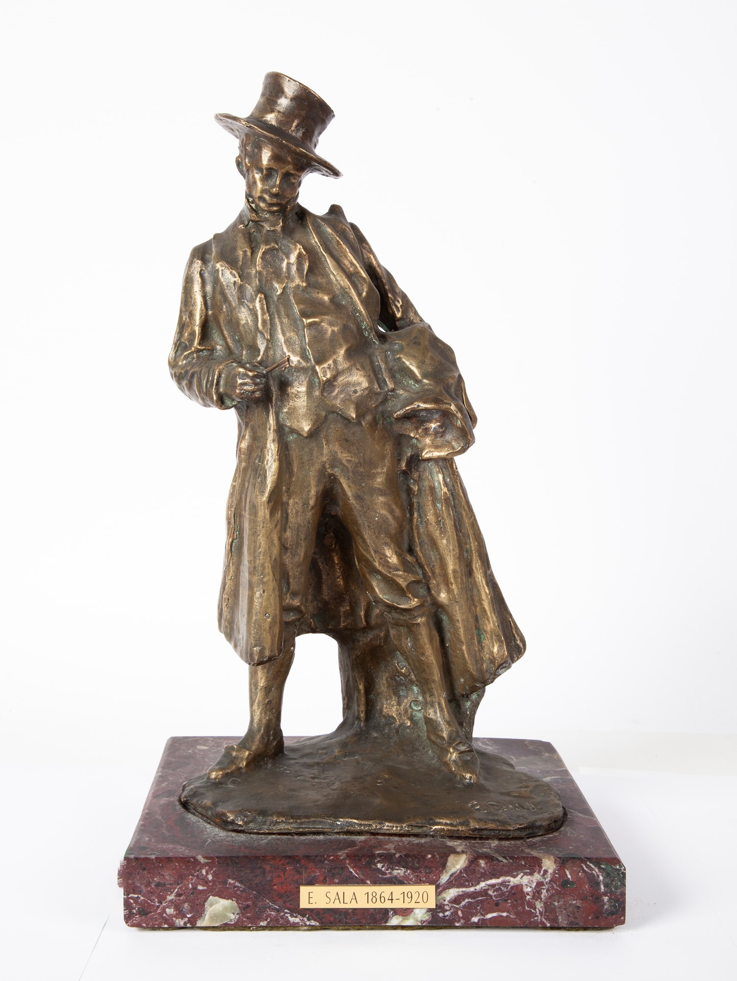 Elia Sala L’ubriaco bronzo a patina dorata su base in marmo rosso altezza cm 35 - l'insieme cm 38x22x21 Scultura raffigurante un uomo con cappello e chiave in mano, ritratto stante con andatura incerta. Firmato E. Sala