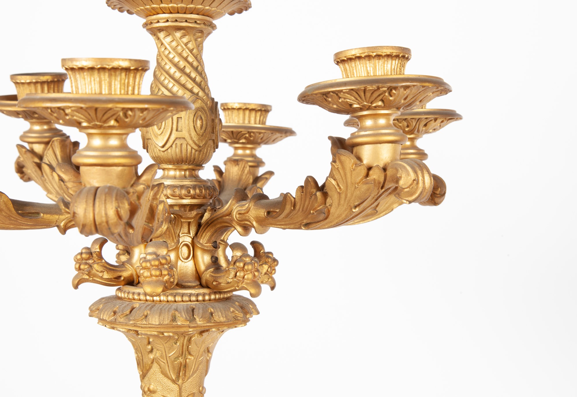 Coppia di candelabri in bronzo dorato a sette luci, XIX secolo altezza cm 68 bracci a forma di cornucopia arricchita da rilievi vegetali e frutti, disposti sulla sommità di una struttura composita costituita da un balaustro con piede a rocchetto su piedistallo caratterizzato da un corteo di amorini resi in bassorilievo