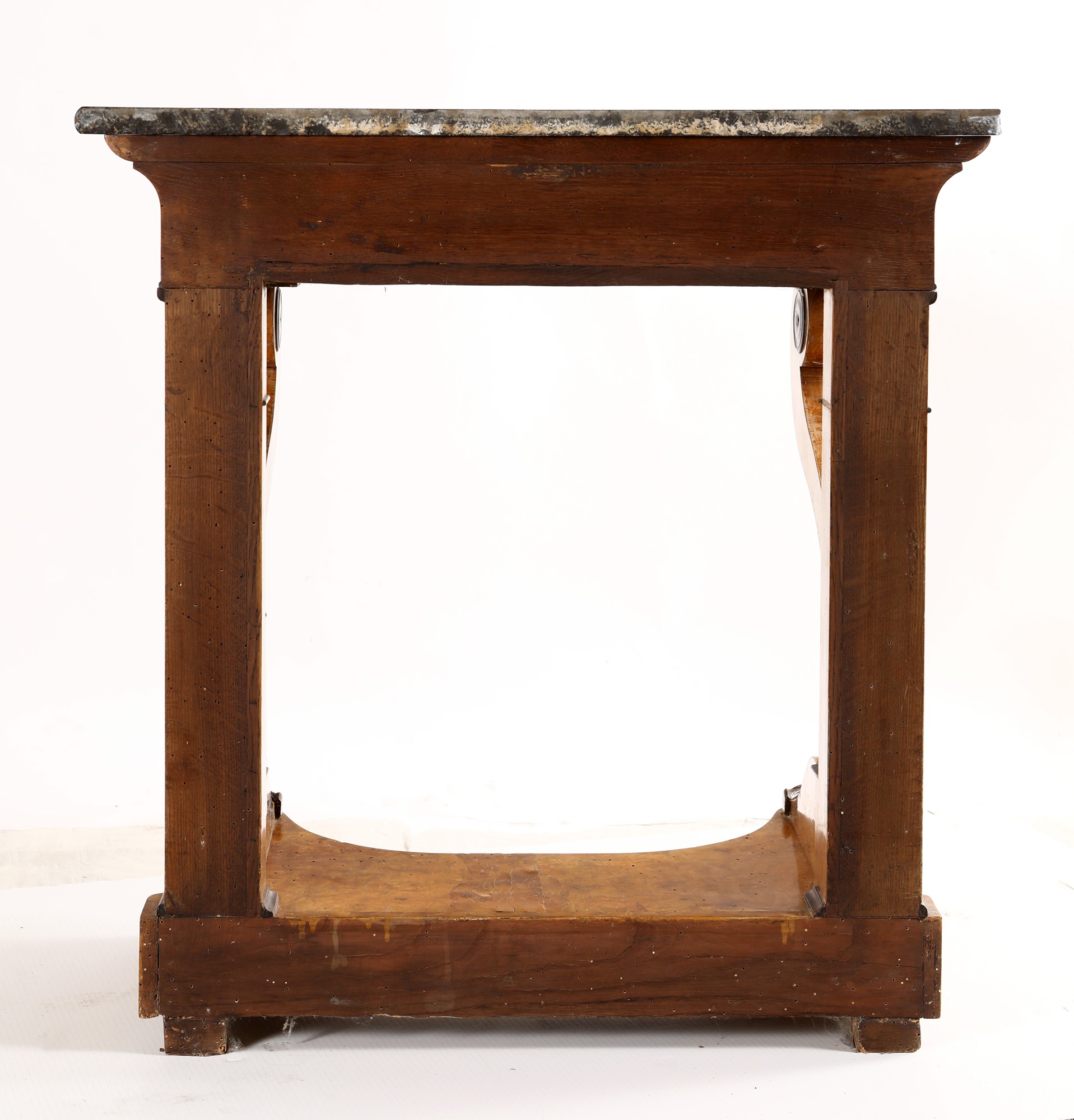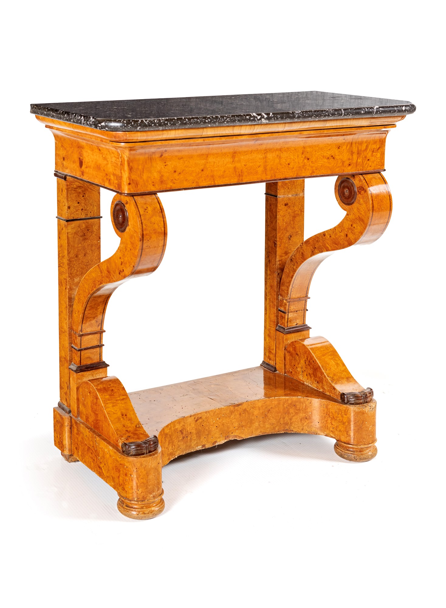 Piccola consolle d'epoca Impero in acero cm 88x84x44 piano in breccia grigia con angoli arrotondati, un cassetto compreso nella fascia, sostegni anteriori curvilinei e posteriori a lesena su base sagomata