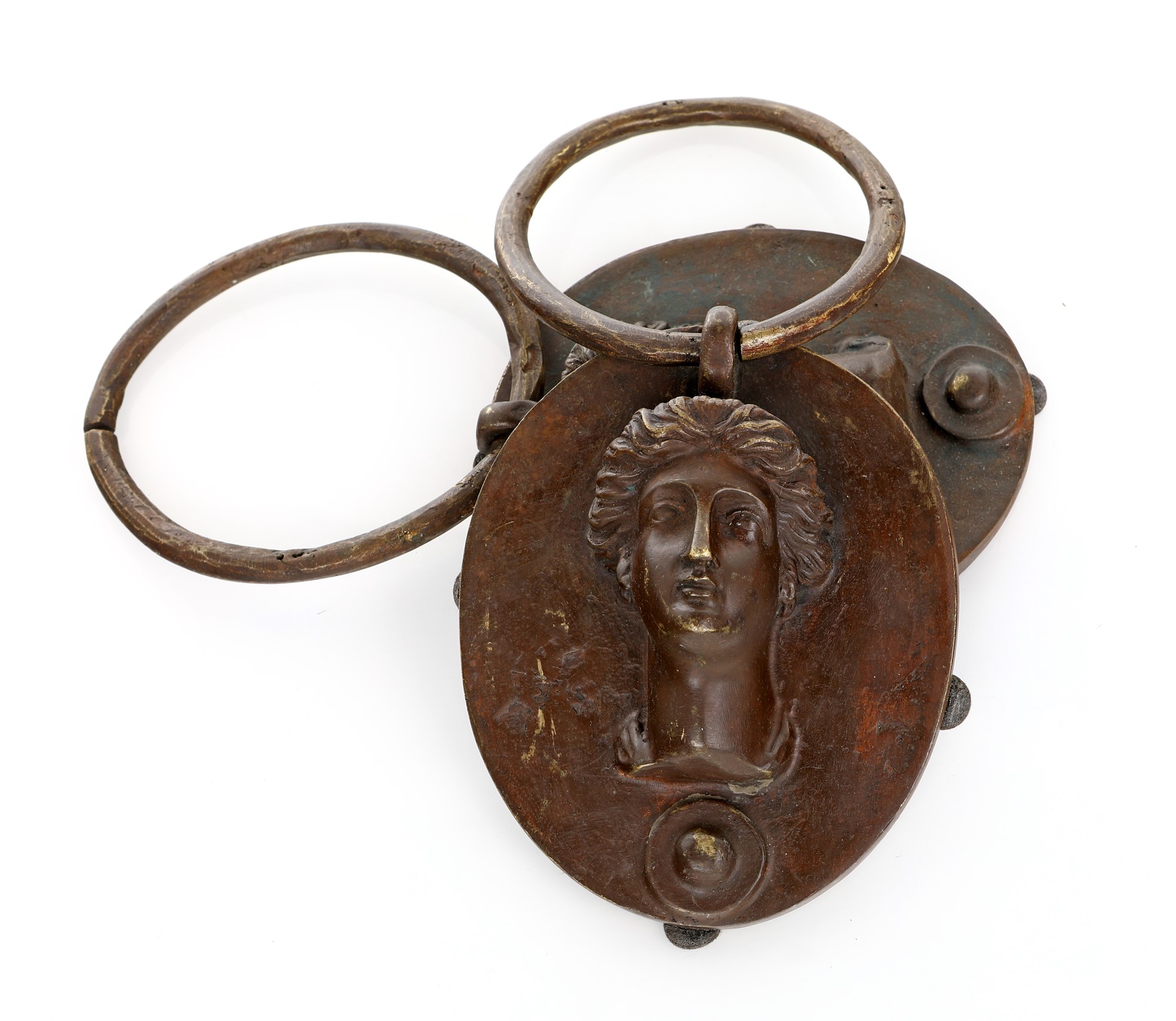 Coppia di battiporta in bronzo brunito, XIX secolo cm 23x28 batacchio ovale caratterizzato da volti muliebri in rilievo e ansola ad anello