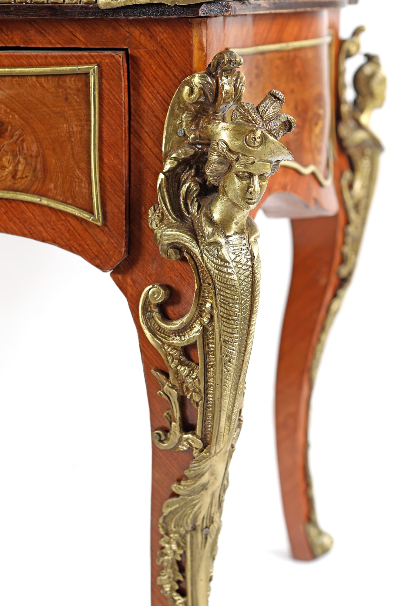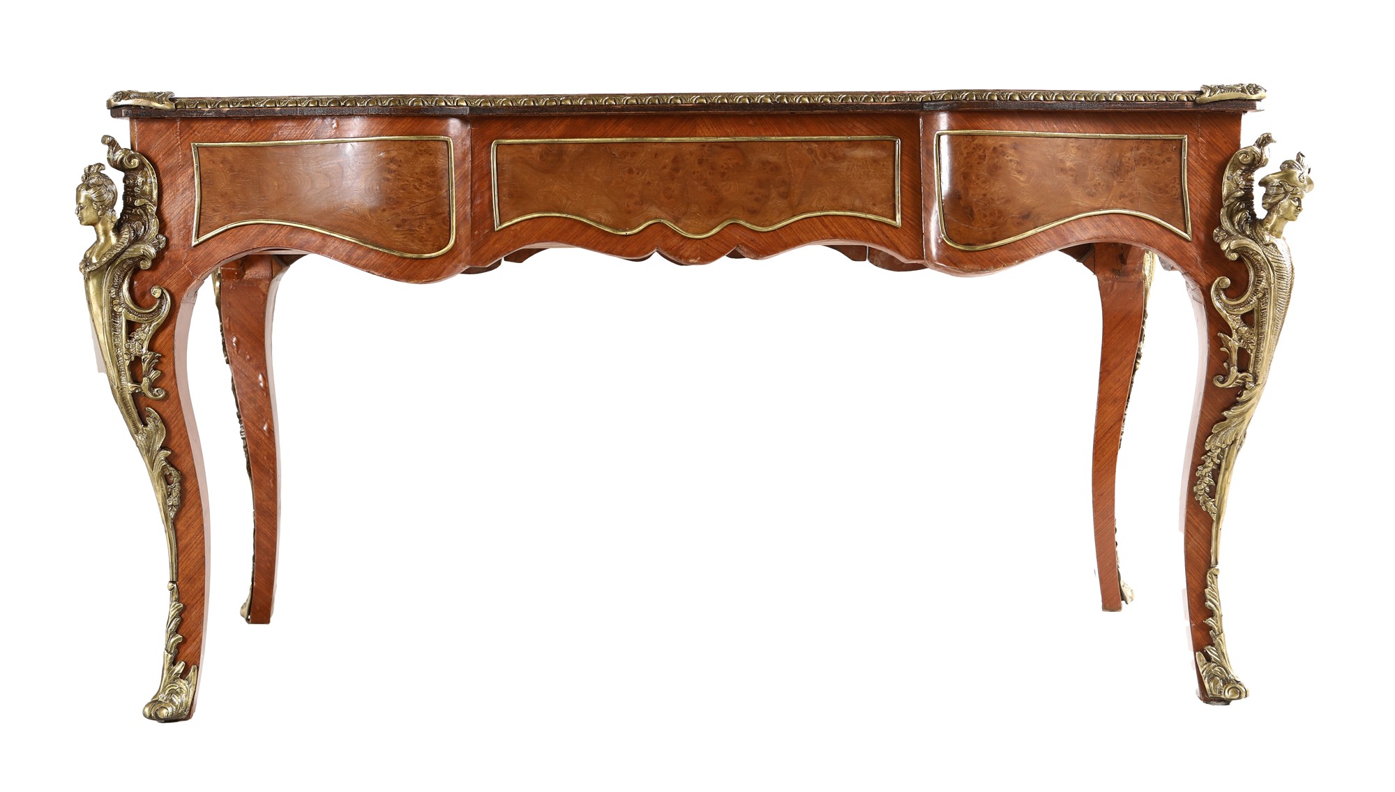 "Bureau plat Louis XV", Francia, XX secolo cm 82x160x82 piano rivestito in pelle, fascia sagomata suddivisa in tre cassetti allineati privi di traverse, gambe mosse calzate da scarpette, abbellite all'attaccatura da espagnolettes in bronzo in forma di erme femminili e maschili