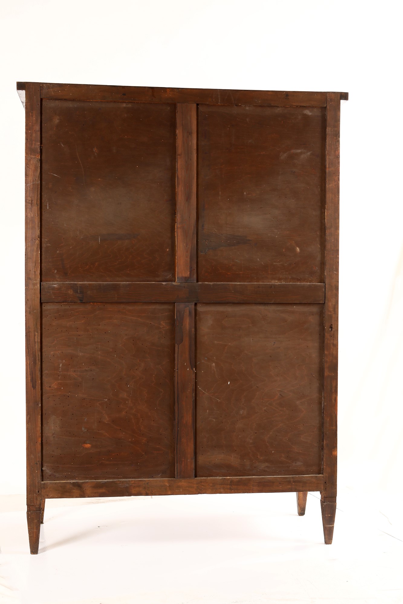 Vetrina in legno intarsiato, inizi del XX secolo cm 164x117x45,5 ispirata ai modelli maggioliniani, con due cassetti allineati nella parte superiore, due ante frontali, piedi rastremati