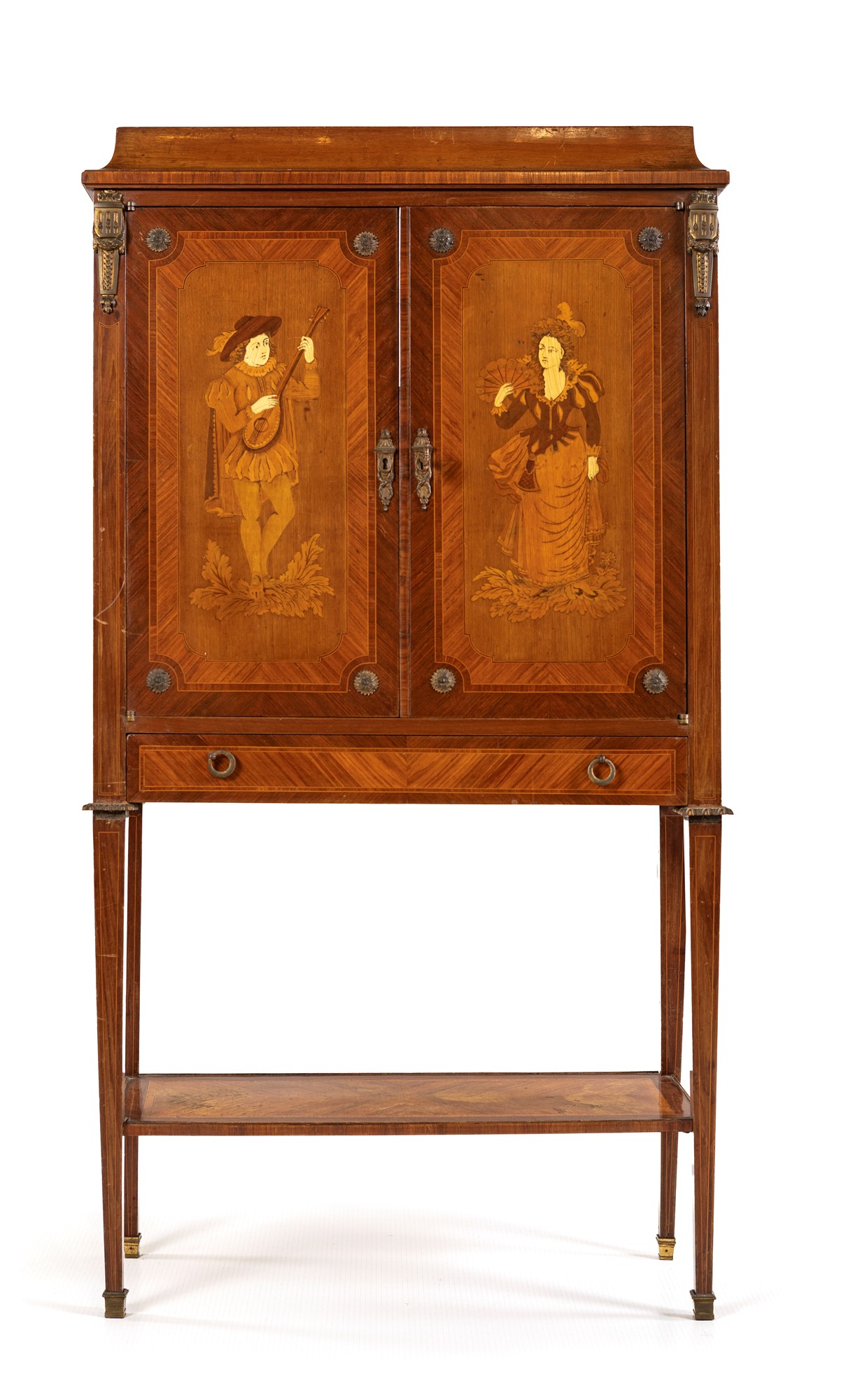 Mobile a due sportelli in legno intarsiato, Inghilterra, fine del XIX/inizi del XX secolo cm 141x76x32 caratterizzato da figure di musico e di dama in abiti rinascimentali poste come ornamento delle ante frontali; gambe rastremate unite da un piano