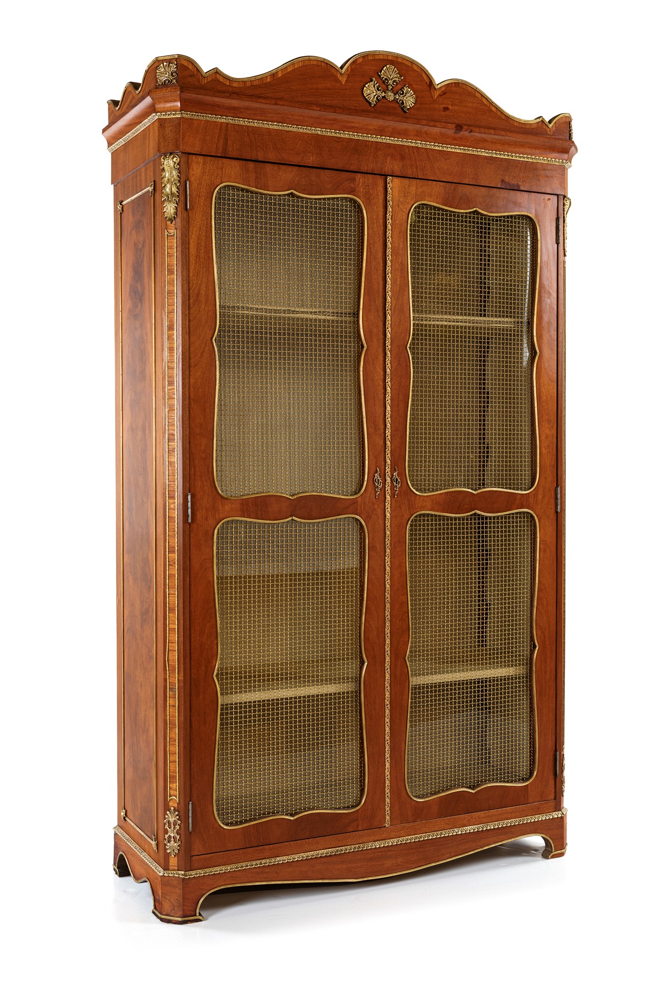 Libreria a due sportelli, Francia inizi del XX secolo cm 192x115x40 con finiture ornamentali intagliate e dorate; ante con specchiature sagomate a rete, piedi a mensola