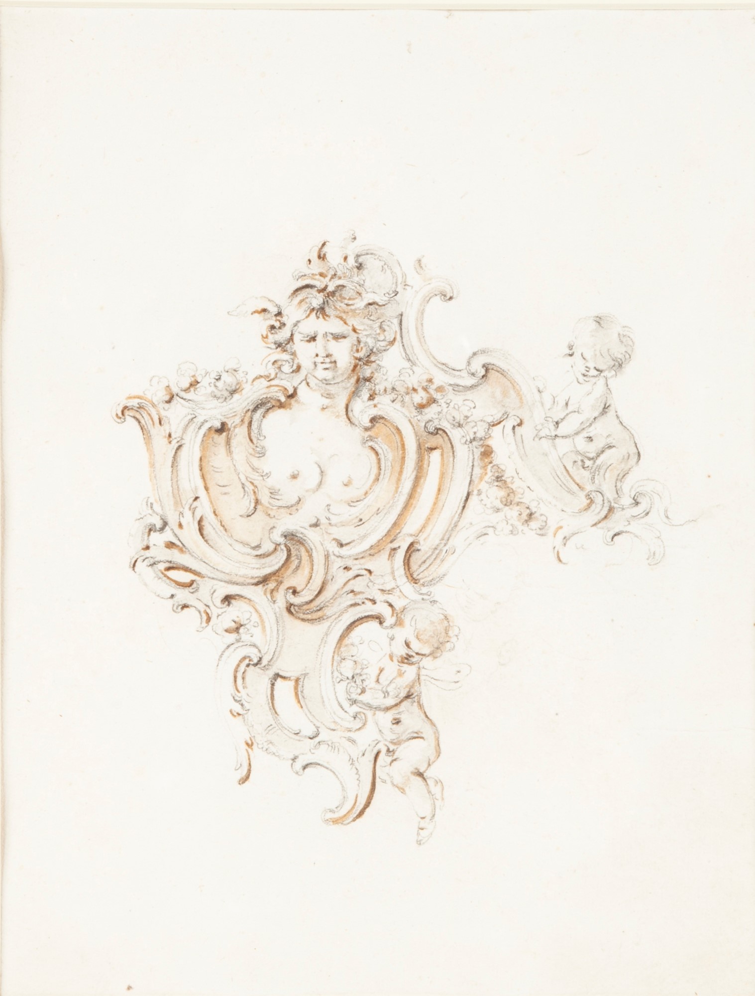 Studio per orologio matita e inchiostro acquerellato su carta mm 250x190 - con cornice cm 43,5x38 Il disegno è uno studio preparatorio per un elemento ligneo di un orologio. L'autore, Giovanni Bettati, fu uno dei più importanti argentieri del XVIII secolo. Dopo un inizio autonomo, dal 1755 passò a lavorare presso la bottega di Luigi Valadier, con il quale continuò a collaborare per tutta la vita. Il nostro foglio si distingue per l'estrema leggerezza del tratto, notabile soprattutto nella resa elegante dei due puttini, delineati dall'inchiostro acquerellato, e nelle decorazioni floreali che contornano la cariatide centrale. La datazione proposta è tra il 1765 e il 1770 per l'affinità con alcuni fogli conservati oggi presso la Nation Gallery di Washington e il Rijksmuseum di Amsterdam.