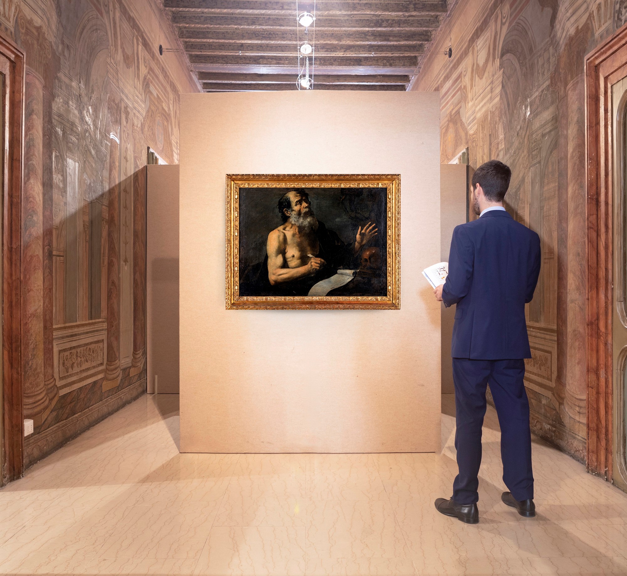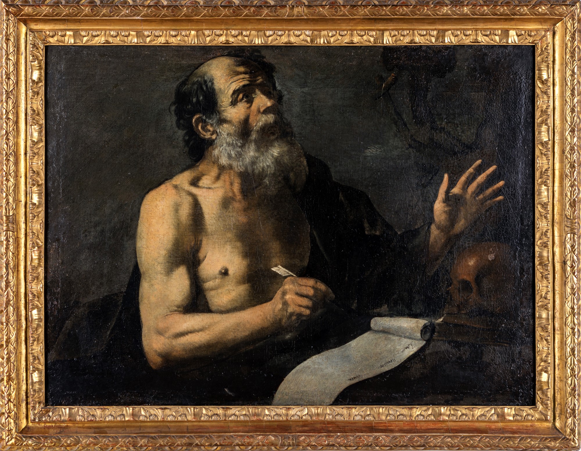 San Girolamo Olio su tela cm 77x103 - in cornice cm 94x121 Il dipinto raffigurante questo San Girolamo, di grande qualità, va inserito quale opere di un pittore gravitante a Roma o a Napoli nella seconda metà dei Seicento. I riferimenti stilistici sono indubbiamente gli artisti caravaggisti quali Hendrik van Sommer e la pittura romana di Giacinto Brandi. La muscolatura del santo è descritta pittoricamente con grande perizia, i muscoli tesi, i tendini e le dita sono resi con estrema precisione anatomica, mentre la barba e i capelli sono descritti con pennellate minuziose