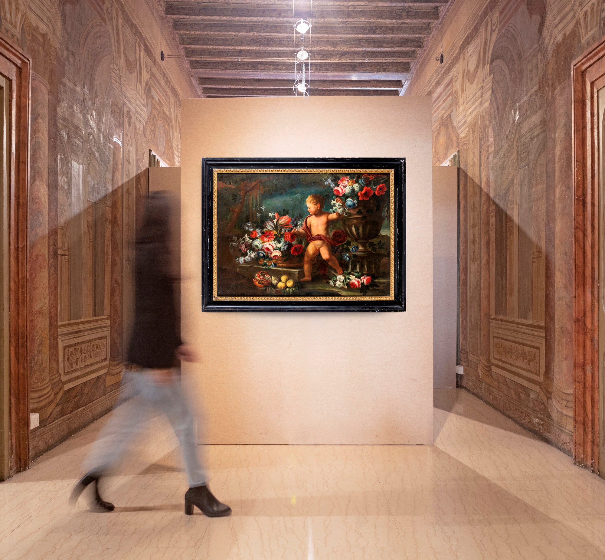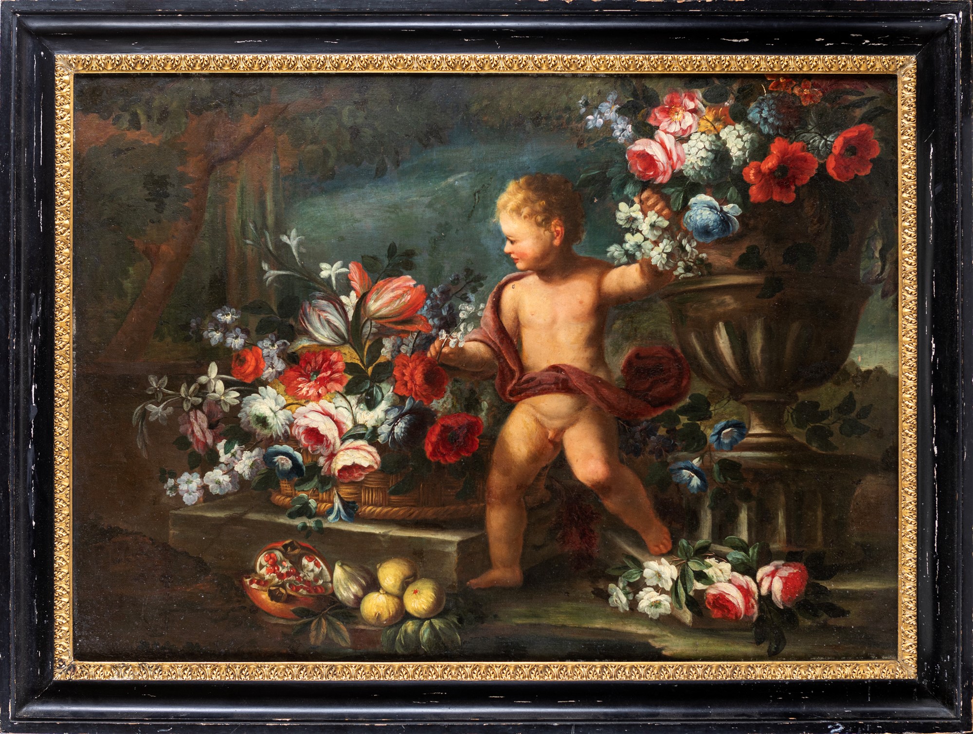 Natura morta di fiori con putto Olio su tela cm 94x130 - con cornice cm 1100x150