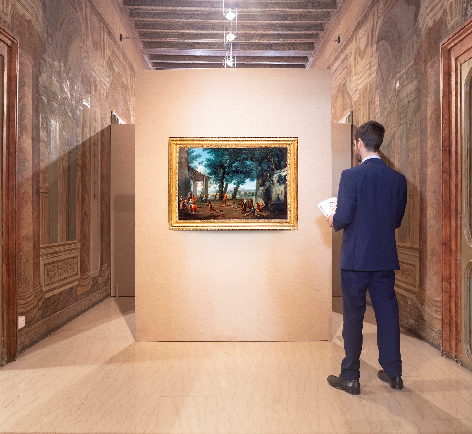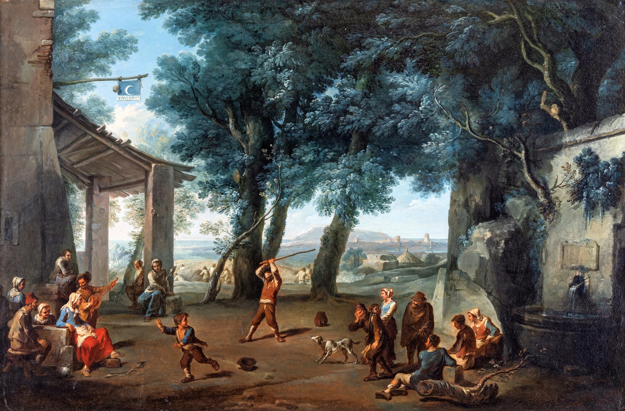 Davanti ad una taverna un giovane si diletta nel gioco della moscacieca con un piccolo bambino. Attorno a loro un gruppo di contadini si rilassa suonando e cantando, mentre sulla destra, davanti ad una fonte da cui sgorga dell'acqua, dei popolani sembrano intendi a godersi la scena. Sullo sfondo, dipinti quasi en grisaille, degli uomini sono ancora a lavoro mentre mietono del grano. L'autore di questa tela, rintracciabile sia per l'inconfondibile stile che per il monogramma posto su una brocca in basso a sinistra, è Paolo Monaldi, pittore romano del XVIII secolo formatosi presso la bottega di Paolo Anesi. Ci troviamo probabilmente di fronte ad uno dei più bei quadri da cavalletto eseguito dall'artista. La maestria con sui costruisce i vari piani prospettici, le calibrate tonalità delle fronte e del cielo, la caratterizzazione di ogni personaggi si staglia su alcuni esemplari di altri pittori e con la medesima iconografia.