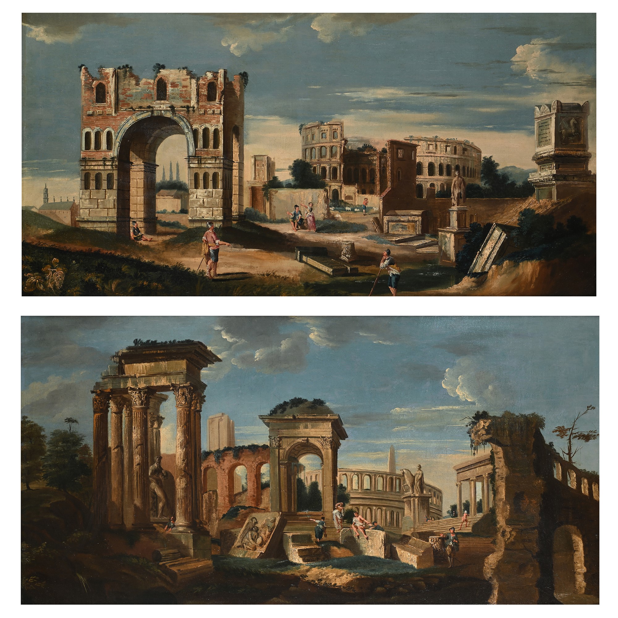 Scuola Romana del XVIII secolo Coppia di capricci architettonici Olio su tela...