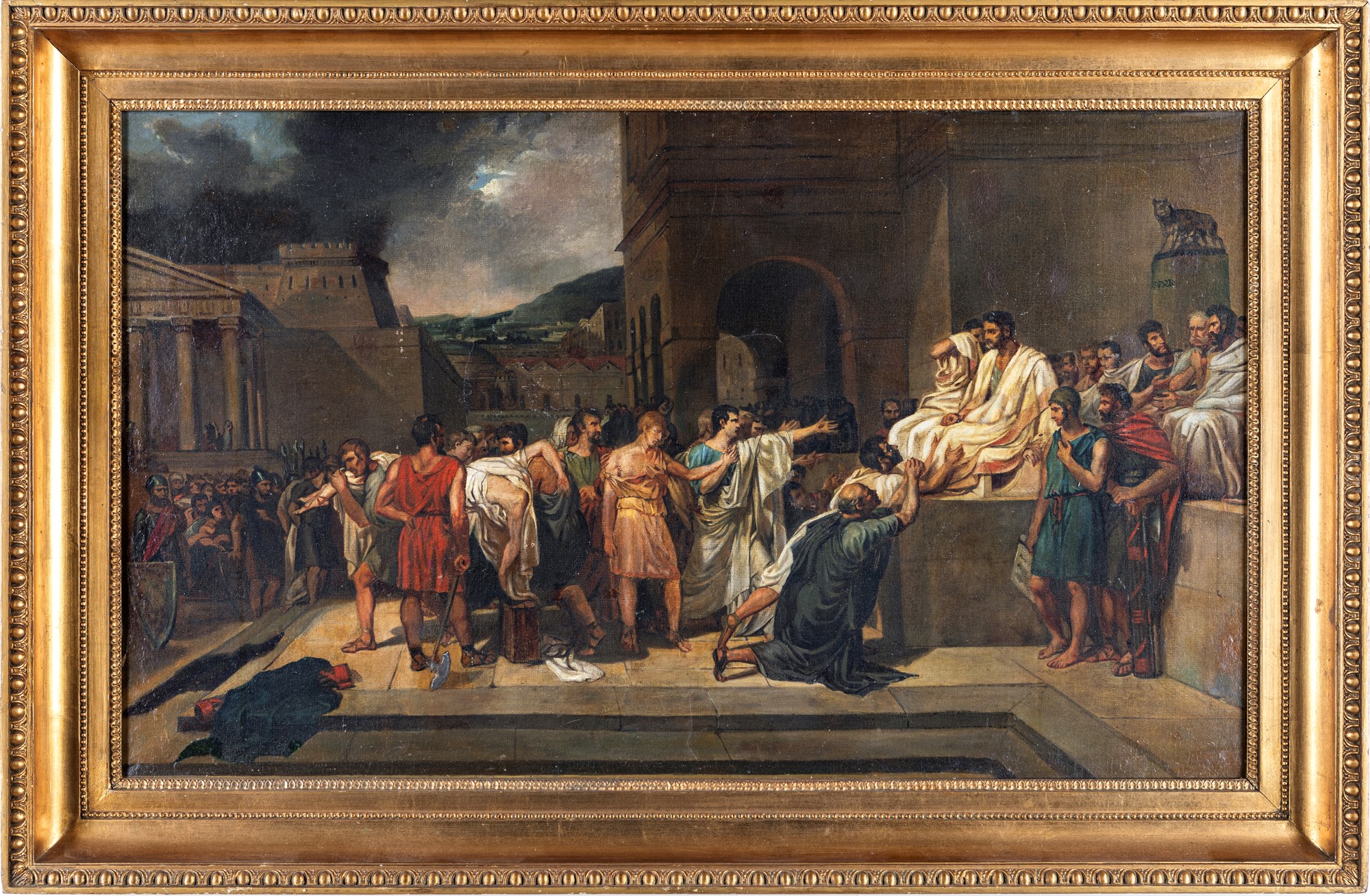 Bruto condanna a morte suo figlio Olio su tela cm 54x92 - con cornice cm 68x104 La bella tela, qui proposta, è probabilmente un bozzetto, dipinto da Lethière stesso o da un suo allievo, preparatorio per il dipinto oggi al Louvre e datato 1811. Le differenze principali tra i due dipinti sono nella parte sinistra: nel bozzetto infatti mancano i personaggi in lacrime che escono dalla scena alla vista del corpo esanime del figlio di Bruto. Nel museo parigino è conservato un disegno preparatorio raffigurante il momento dell'esecuzione (INV. RF 36492).