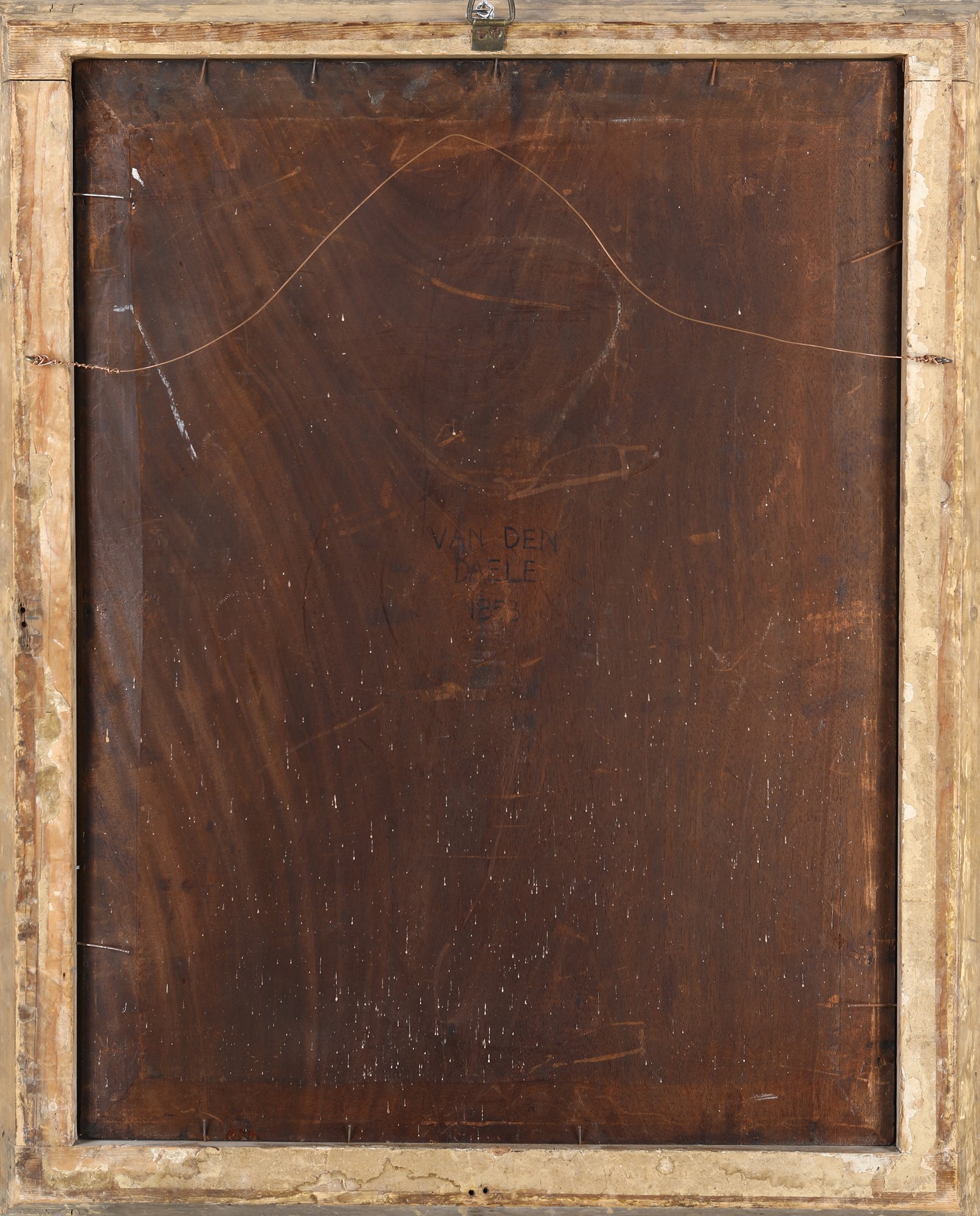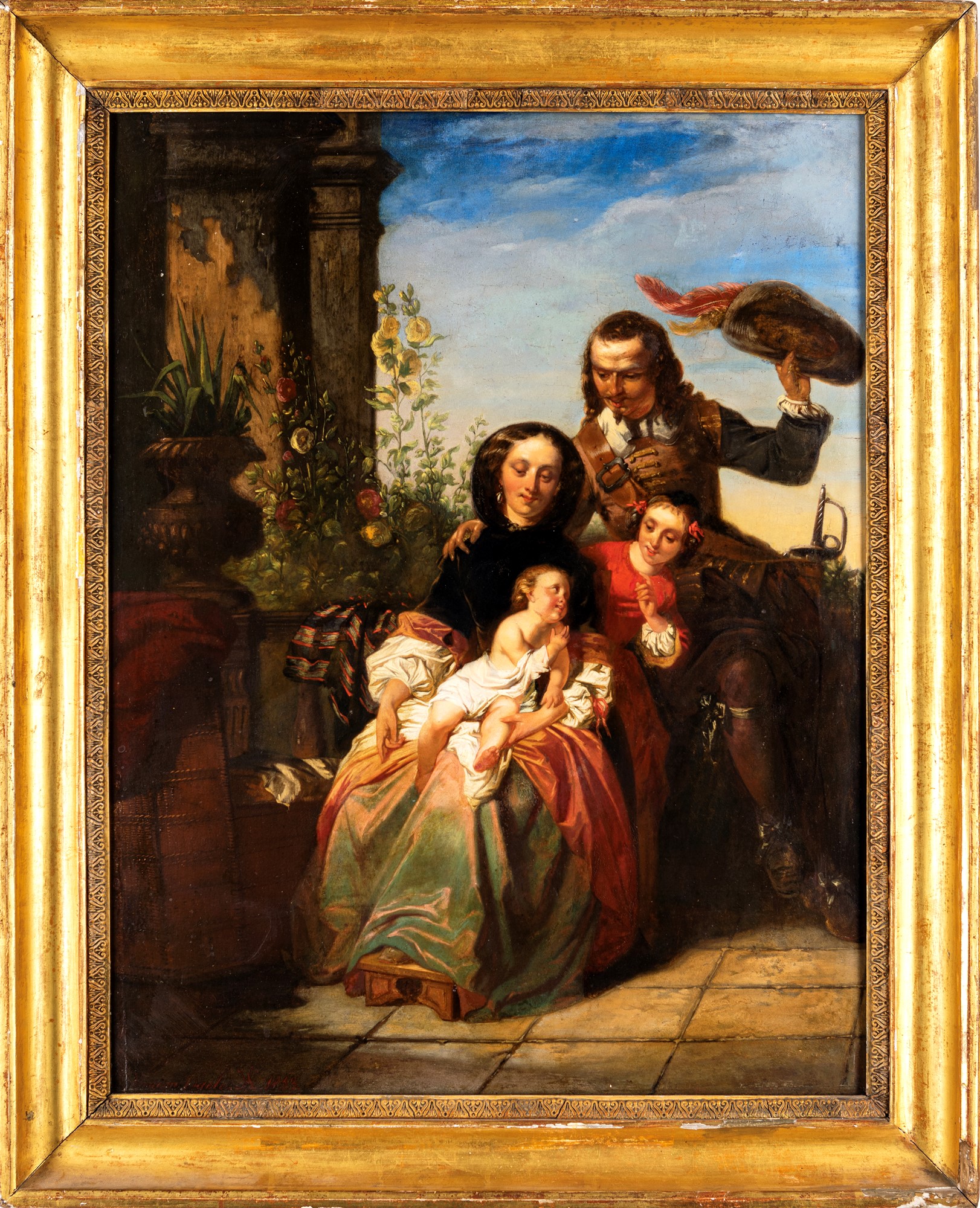 Famiglia nel giardino 1853 Olio su tavola cm 72x55 - in cornice cm 83x67 Firma e data in basso a sinistra "Van Den Daele 1853"