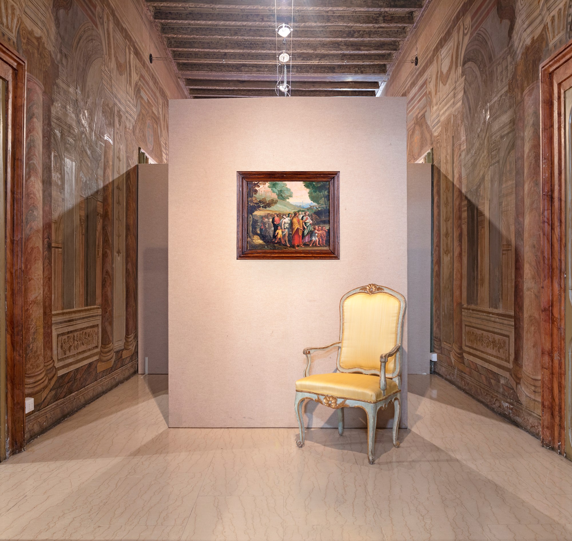 Corteo di Diana olio su tela cm 56x63 - in cornice: 66x77 La pennellata fluente, le caratterizzazioni fisiche e le pose delle figure suggeriscono l'intervento di un pittore di area bolognese. La tela è accompagnata da una cornice in legno, coeva con l'esecuzione del dipinto.