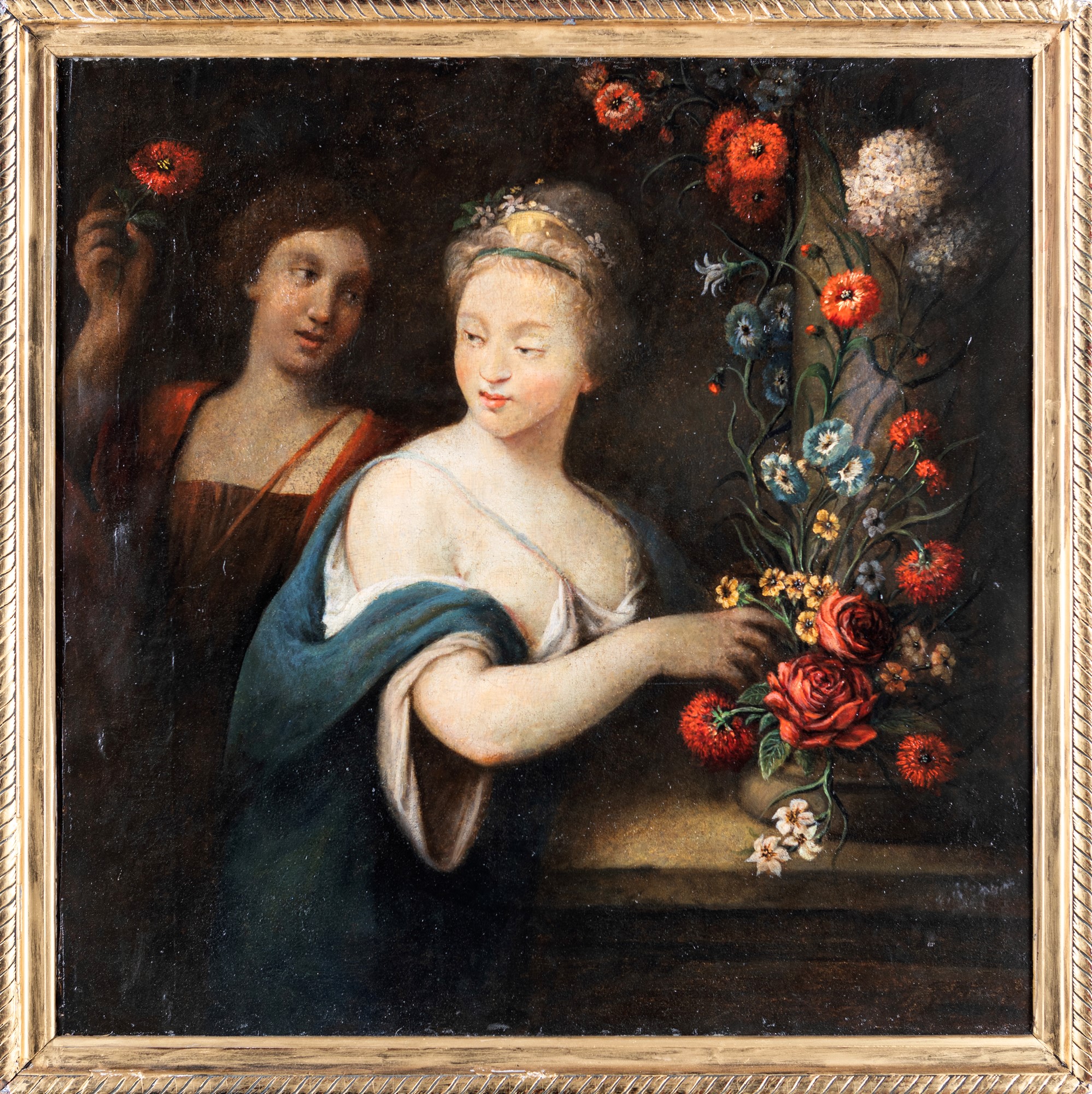 Le due protagoniste del nostro dipinto, da ritenersi una allegoria dell'olfatto per la presenza massiccia di fiori, si stanno scambiando una sensuale e languido sguardo. Le tonalità pastello, le linee morbide fanno pensare ad un pittore di area francese che si è formato sugli esempi di Antoine Watteau e Jean-Honoré Fragonard.