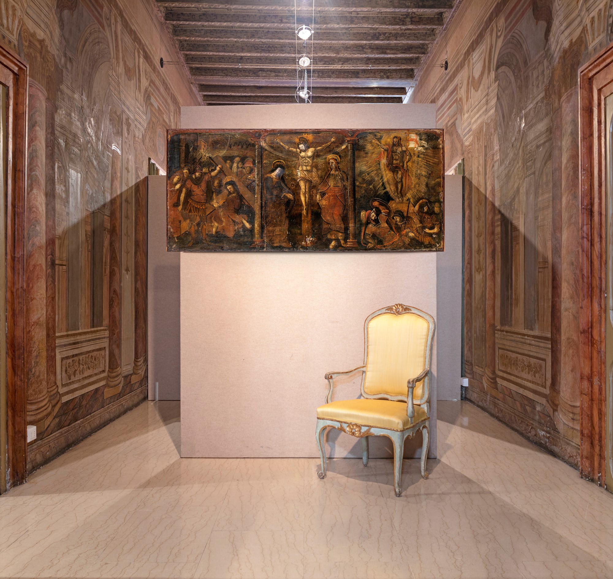 Scuola italiana del XVI secolo Crocefissione Olio su tela cm 87x196