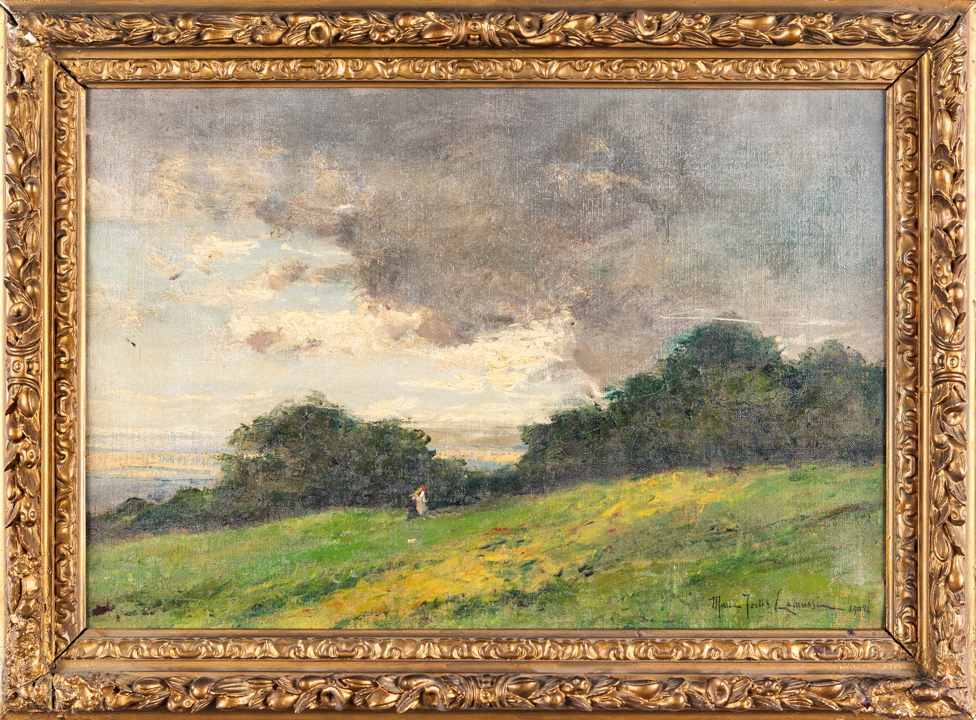 Paesaggio con figura olio su tela cm 42x62 - in cornice cm 55x75 Firmato e datato in basso a destra "Maria Fortis Camussi 1909"; al verso etichetta di esposizione frammentaria Roma 1911