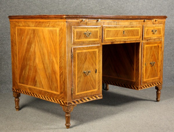 Scrivania da centro lastronata in legno di noce e filettata in legno chiaro, tre cassetti e due sportelli da ambo i lati, uno con sottopiano scorrevole. Veneto. XVIII secolo. Mis. Lung. cm. 122 Alt. cm. 83 Prof. cm. 67 ca.