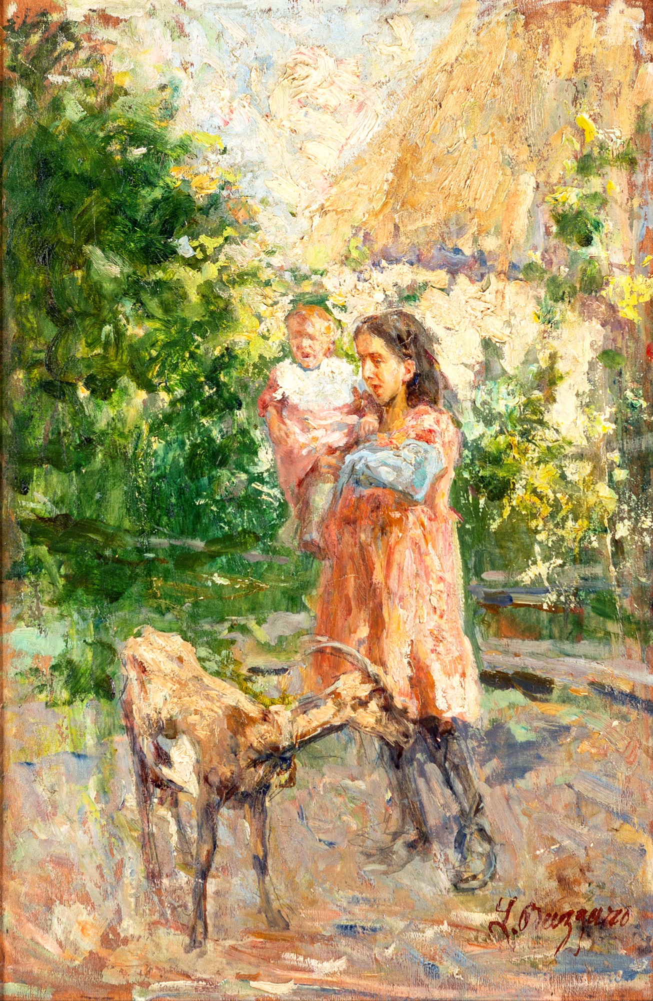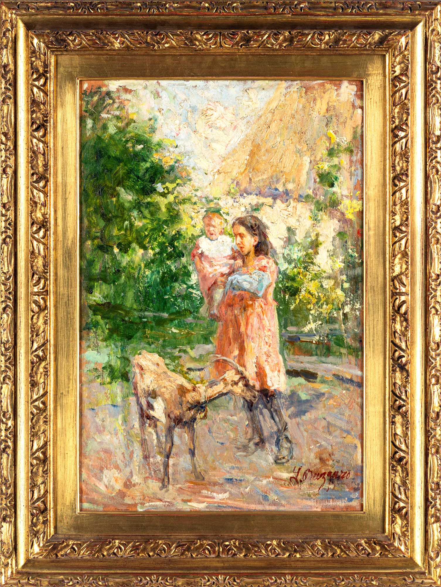 Contadina e capretta 1920-22 olio su tavola cm 60x40 - in cornice cm 82x62 Firmato in basso a sinistra "L Bazzaro" F.L. Maspes, E. Savoia, Leonardo Bazzaro. Catalogo ragionato delle opere, Crocetta del Montello, Antiga Edizioni, 2011, pp. 330-331, n. 594 Mostra individuale di Leonardo Bazzaro, Milano, Galleria Pesaro